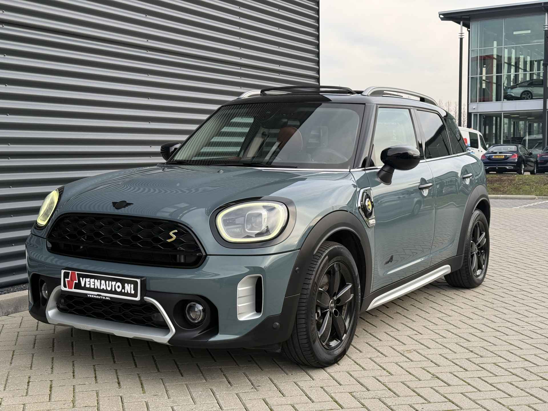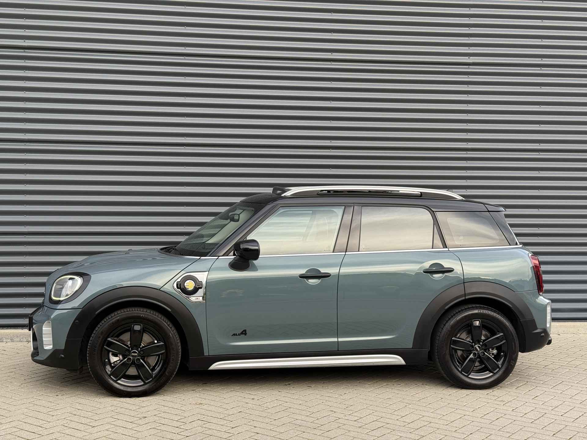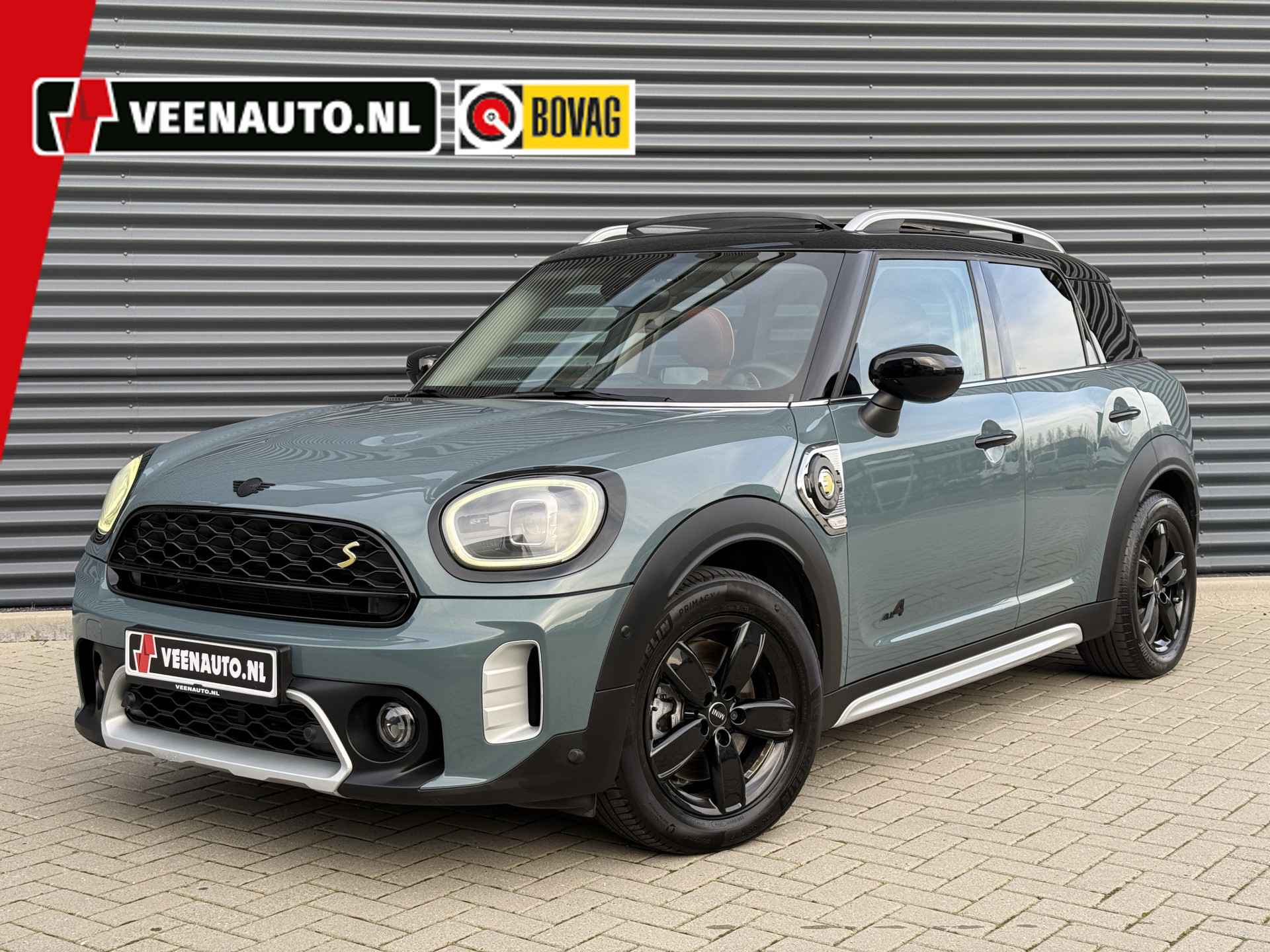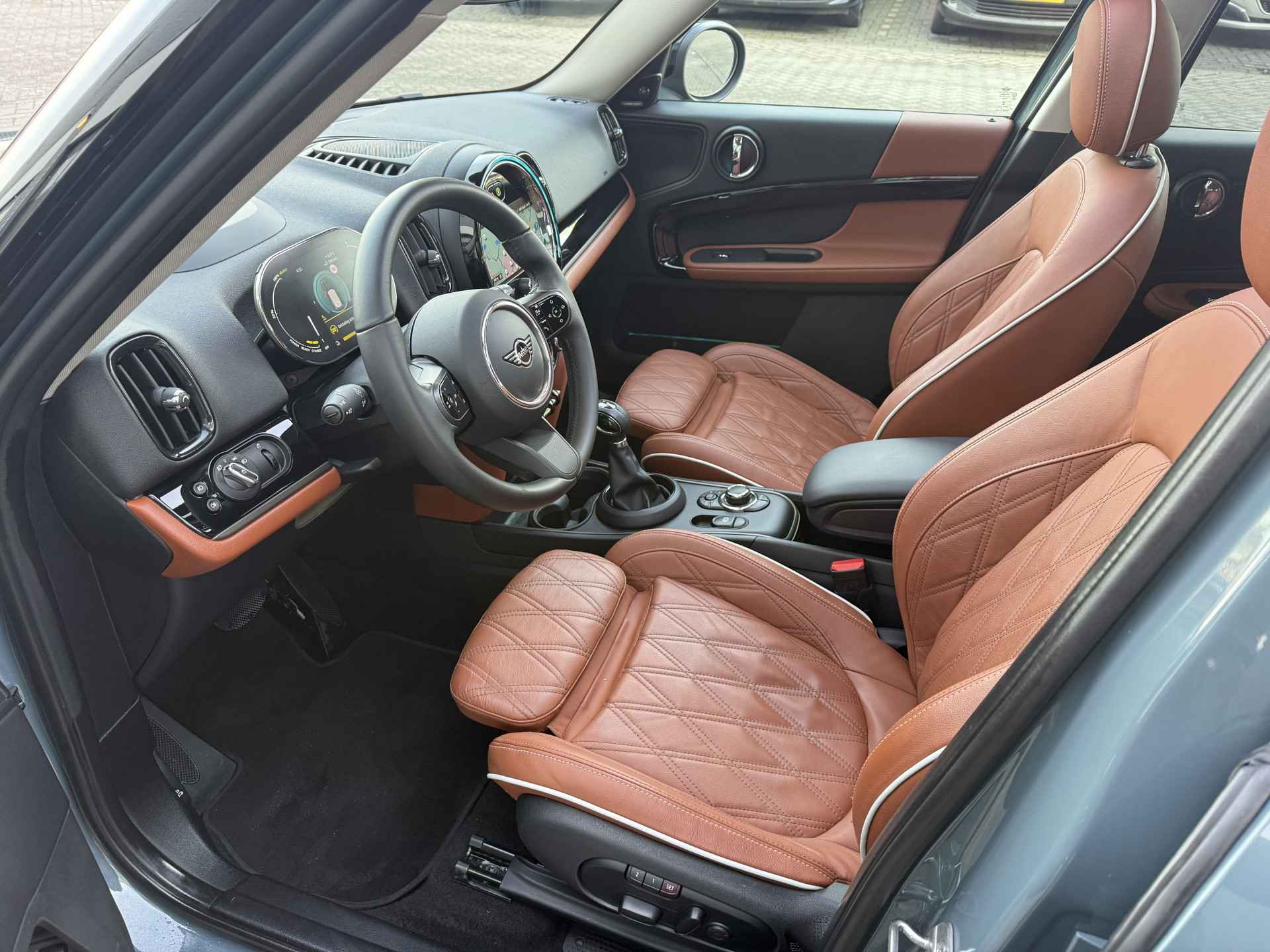 Schitterende Mini Countryman 2.0 Cooper SE ALL4 Plug in Hybrid in Sage Green metallic met hoogglans zwarte licht metalen velgen. Deze Mini is bijzonder compleet uitgerust met onder andere de volgende opties: Panorama dak, Harman Kardon Audio, stoelverwarming, Chester Malt lederen sport-comfort stoelen elektrisch bedienbaar met memory, Apple Carplay, achteruitrijcamera, navigatie, virtuele cockpit, Head Up display, adaptieve cruise control, keyless entry, parkeersensoren voor + achter met parkeer assistent, etc..