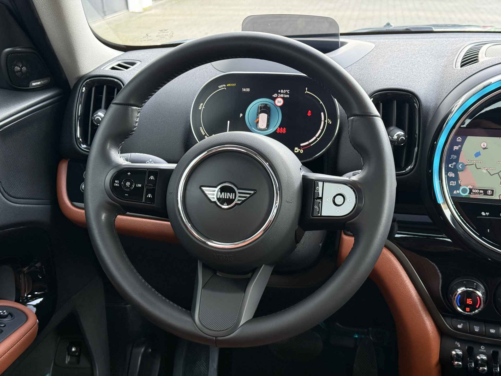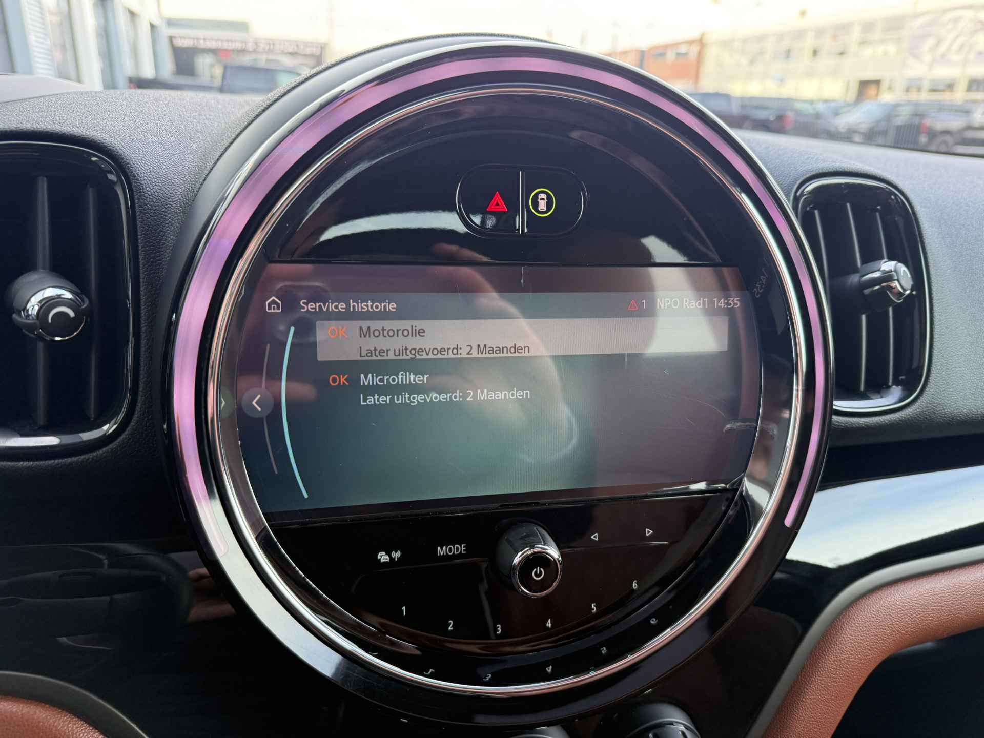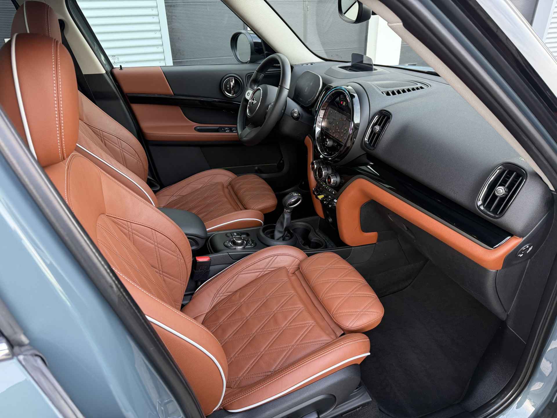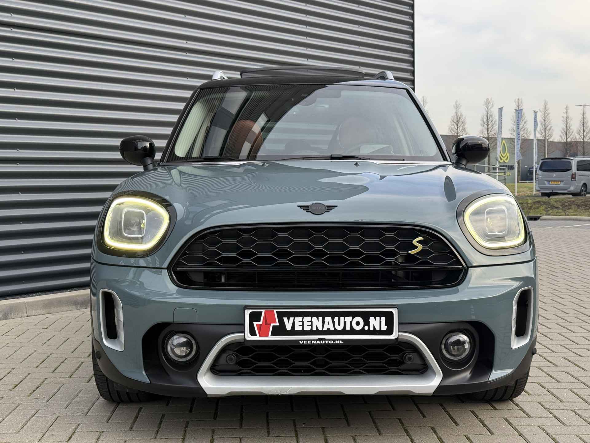 Schitterende Mini Countryman 2.0 Cooper SE ALL4 Plug in Hybrid in Sage Green metallic met hoogglans zwarte licht metalen velgen. Deze Mini is bijzonder compleet uitgerust met onder andere de volgende opties: Panorama dak, Harman Kardon Audio, stoelverwarming, Chester Malt lederen sport-comfort stoelen elektrisch bedienbaar met memory, Apple Carplay, achteruitrijcamera, navigatie, virtuele cockpit, Head Up display, adaptieve cruise control, keyless entry, parkeersensoren voor + achter met parkeer assistent, etc..