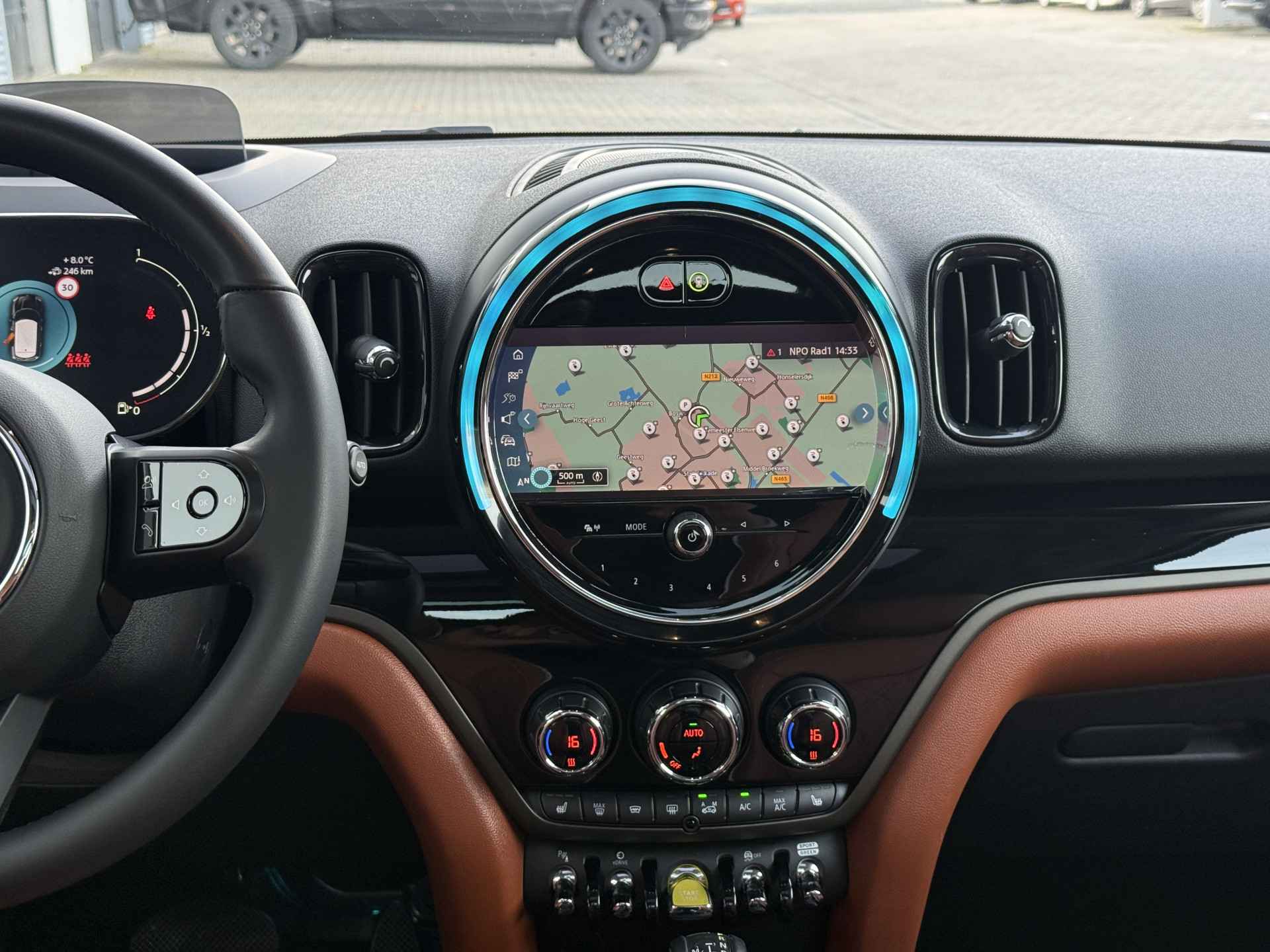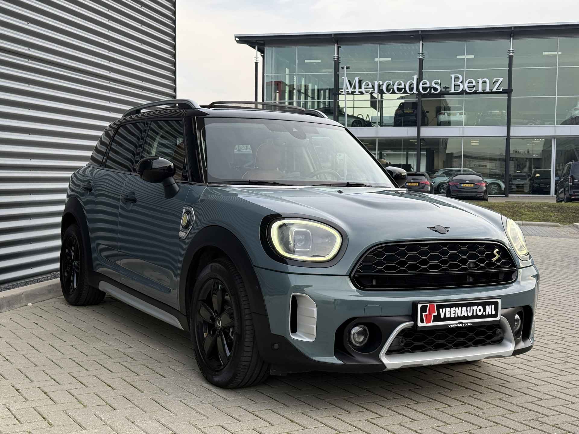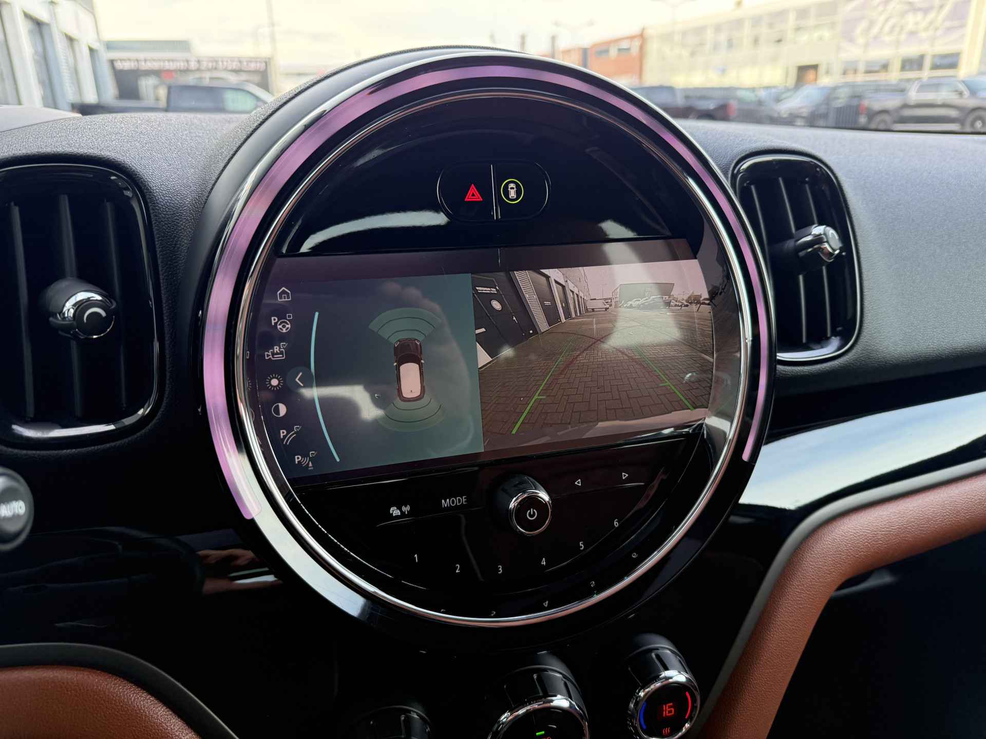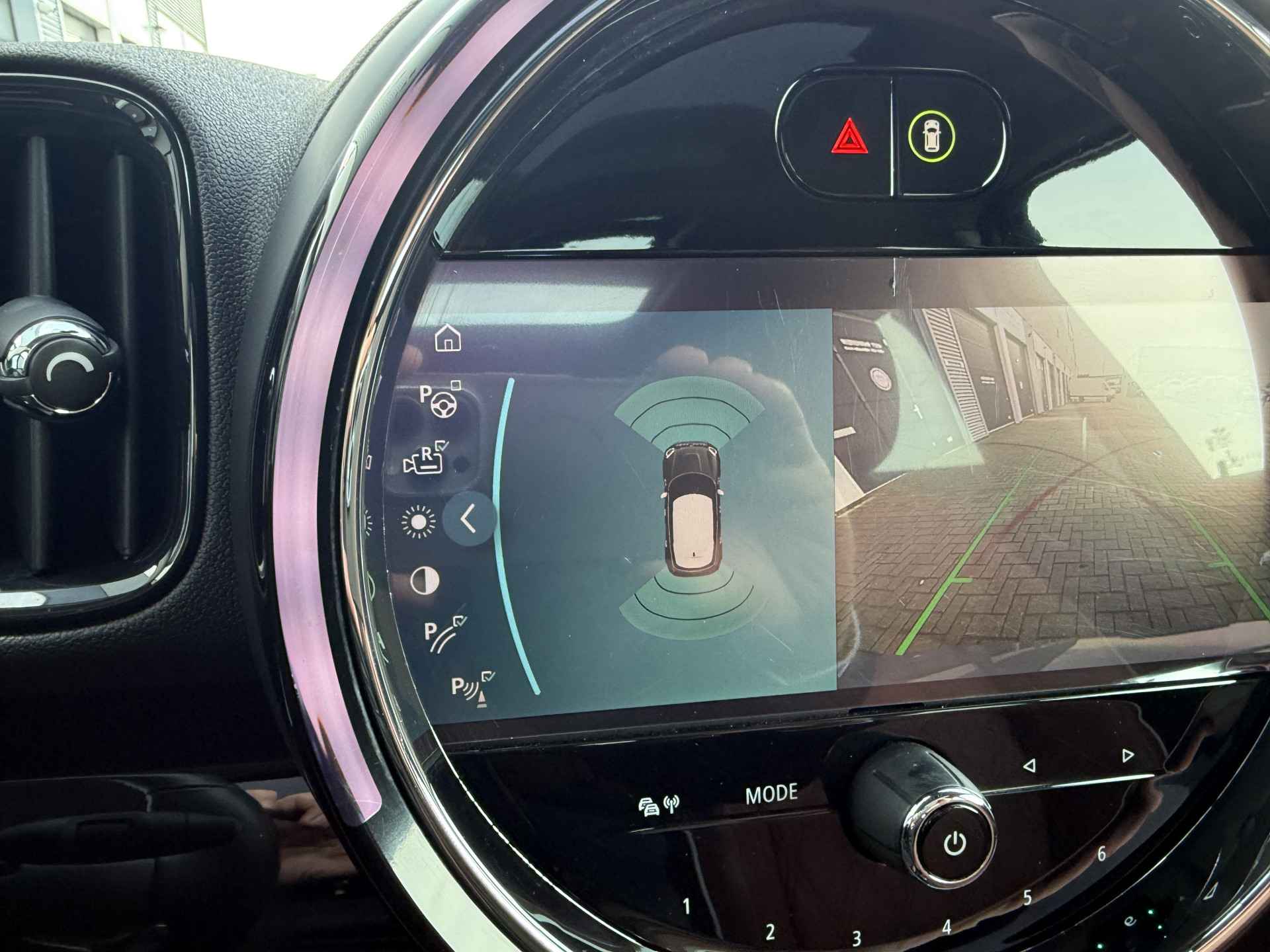 Schitterende Mini Countryman 2.0 Cooper SE ALL4 Plug in Hybrid in Sage Green metallic met hoogglans zwarte licht metalen velgen. Deze Mini is bijzonder compleet uitgerust met onder andere de volgende opties: Panorama dak, Harman Kardon Audio, stoelverwarming, Chester Malt lederen sport-comfort stoelen elektrisch bedienbaar met memory, Apple Carplay, achteruitrijcamera, navigatie, virtuele cockpit, Head Up display, adaptieve cruise control, keyless entry, parkeersensoren voor + achter met parkeer assistent, etc..