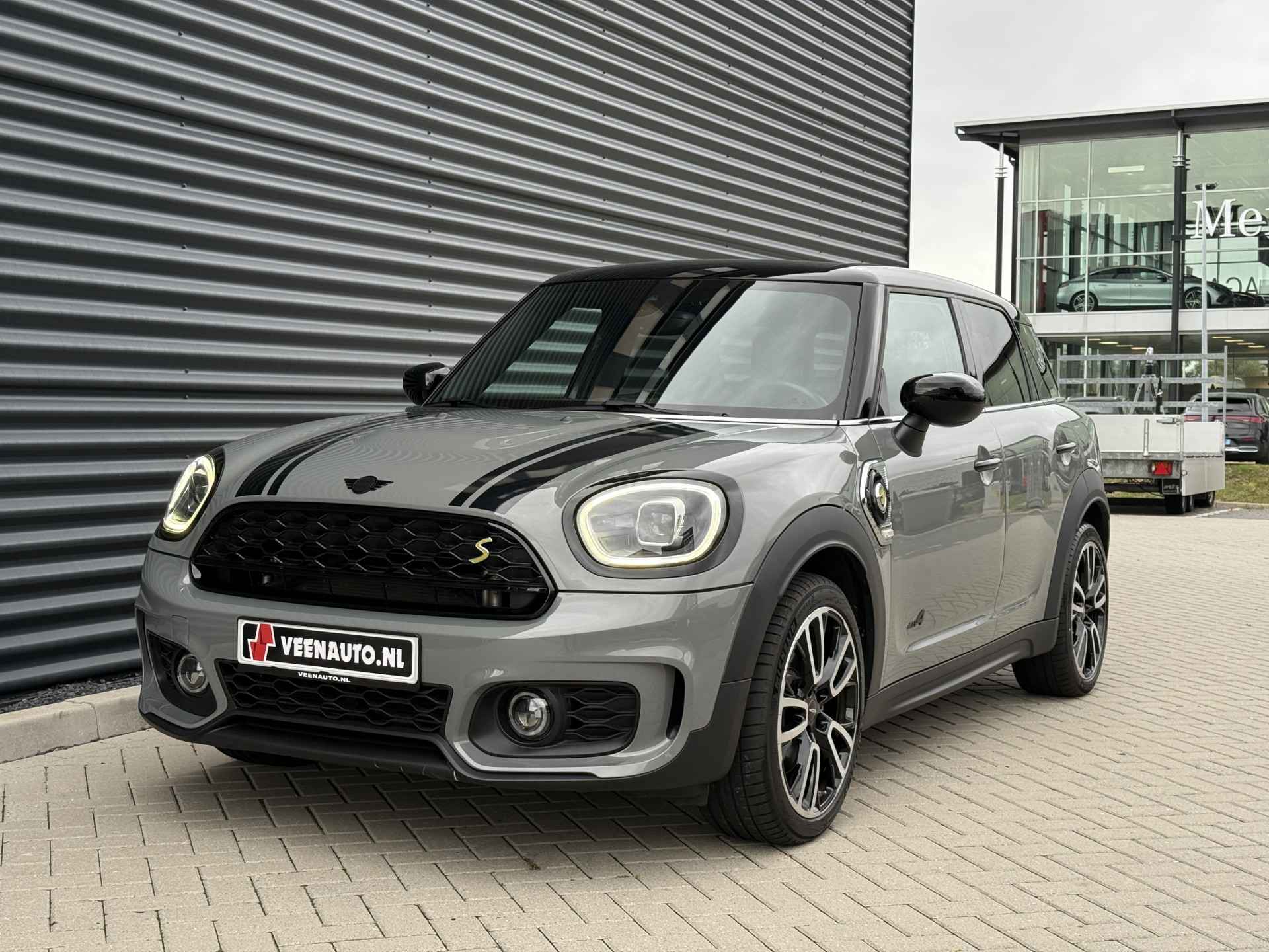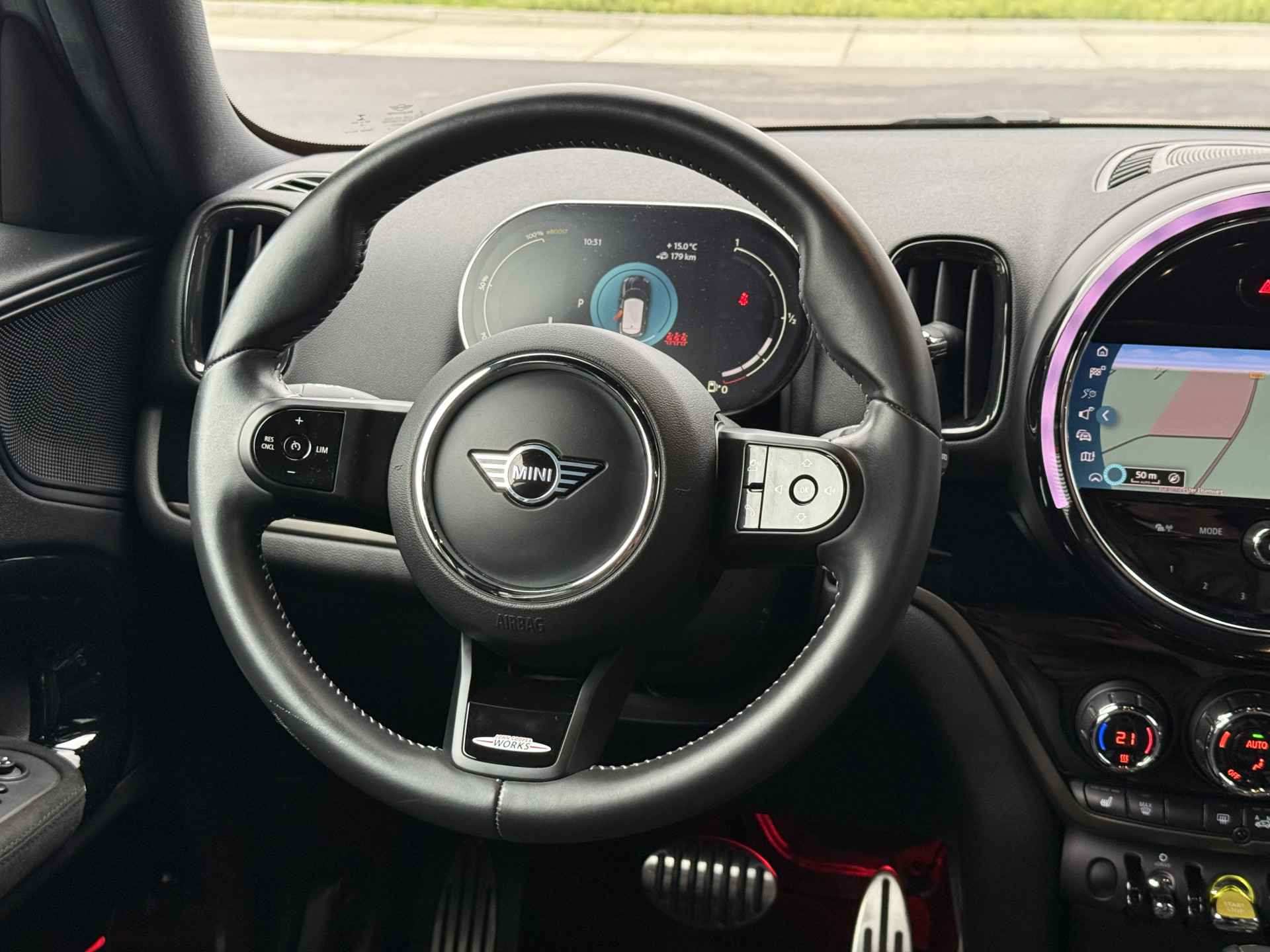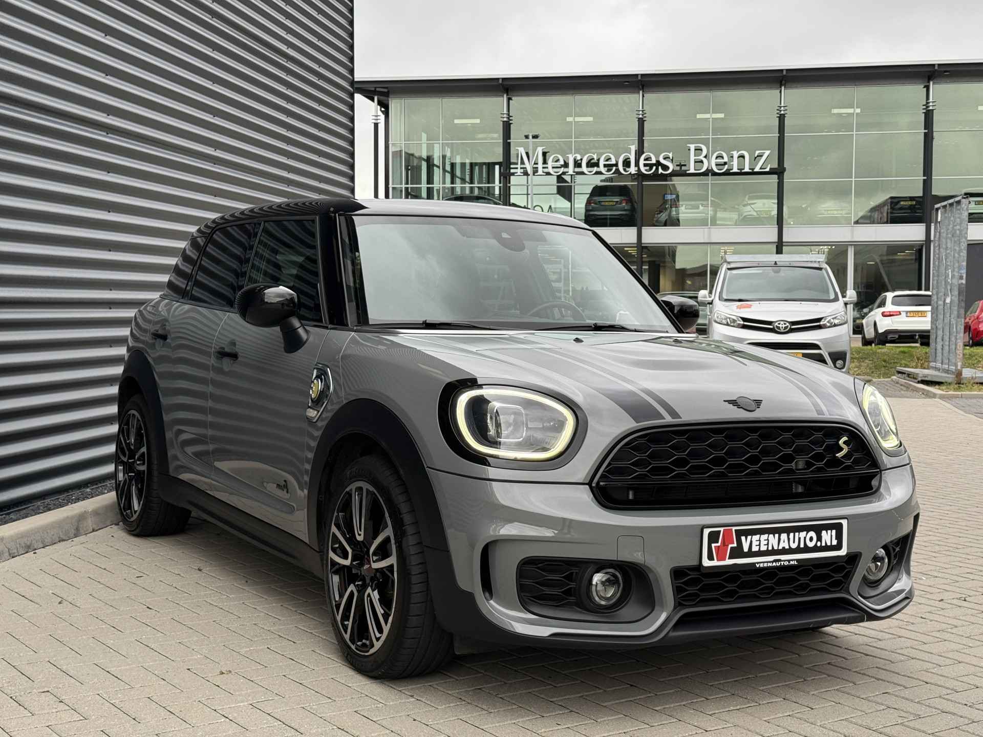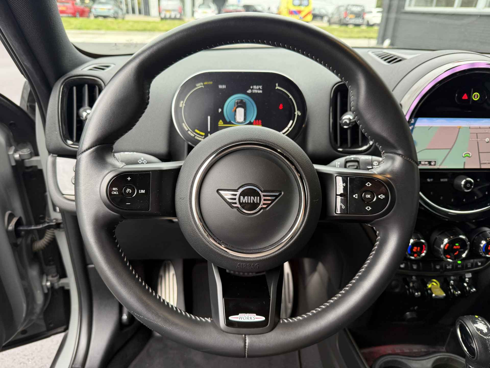 Schitterende Mini Countryman SE Plug in Hybride John Cooper Works in Moonwalk Grey metallic met Black Optic pakket en 19 inch JCW licht metalen velgen. De Mini is voorzien van veel gave opties zoals: Apple carplay, achteruitrijcamera, navigatie, keyless entry, virtuele cockpit, stoelverwarming, parkeersensoren , draadloze telefoonlader, LED sfeer interieur verlichting, cruise control, etc..