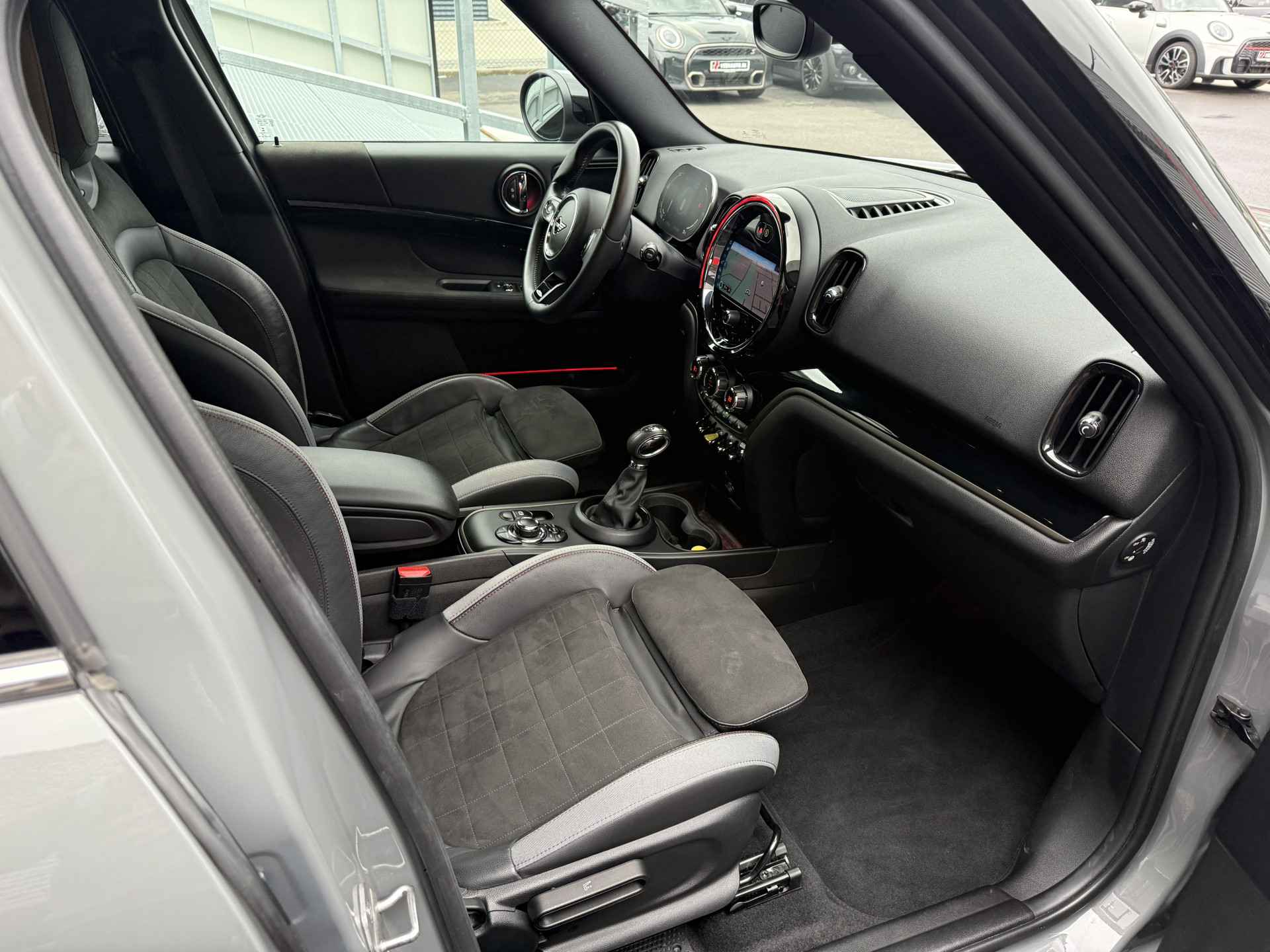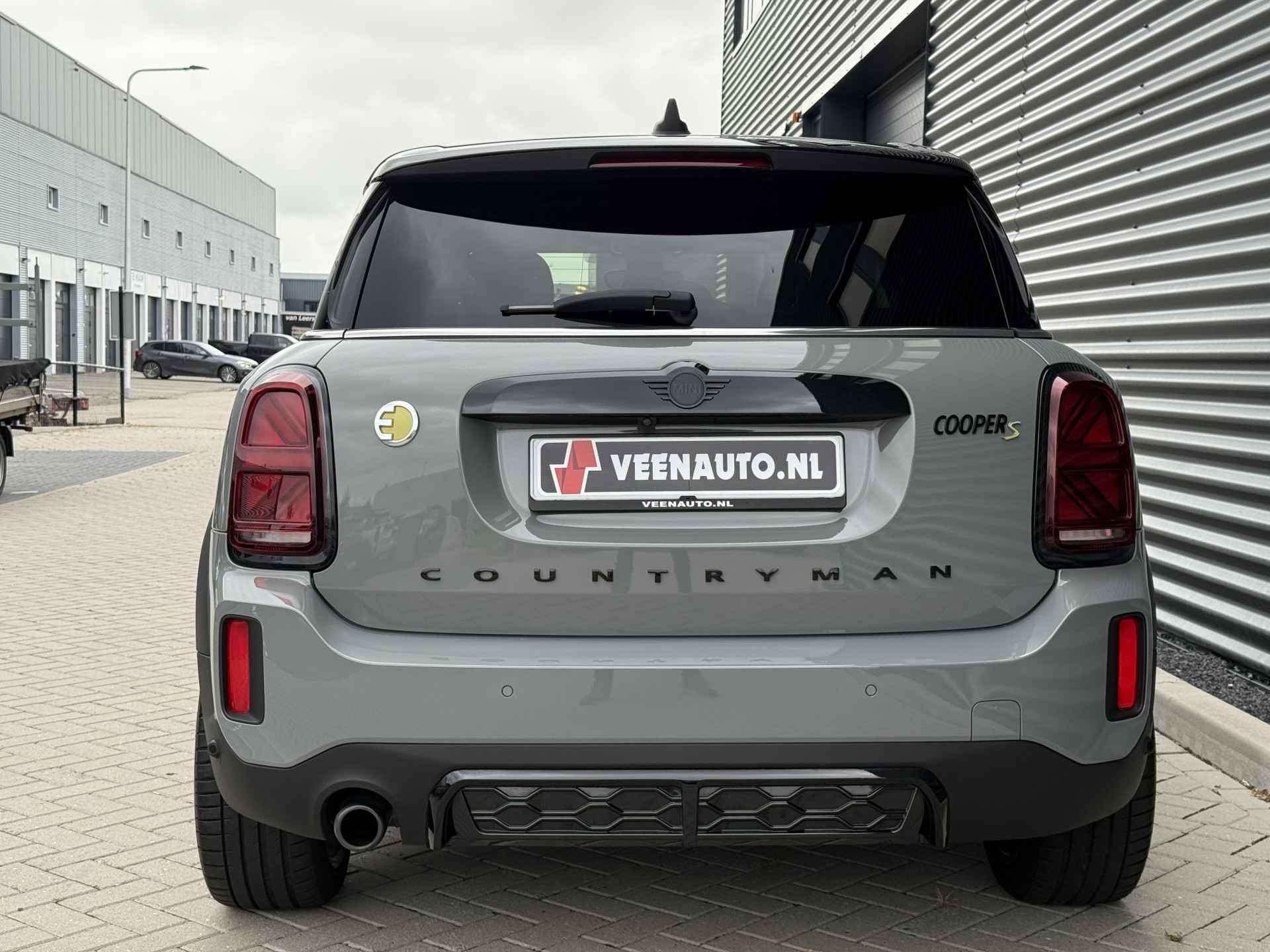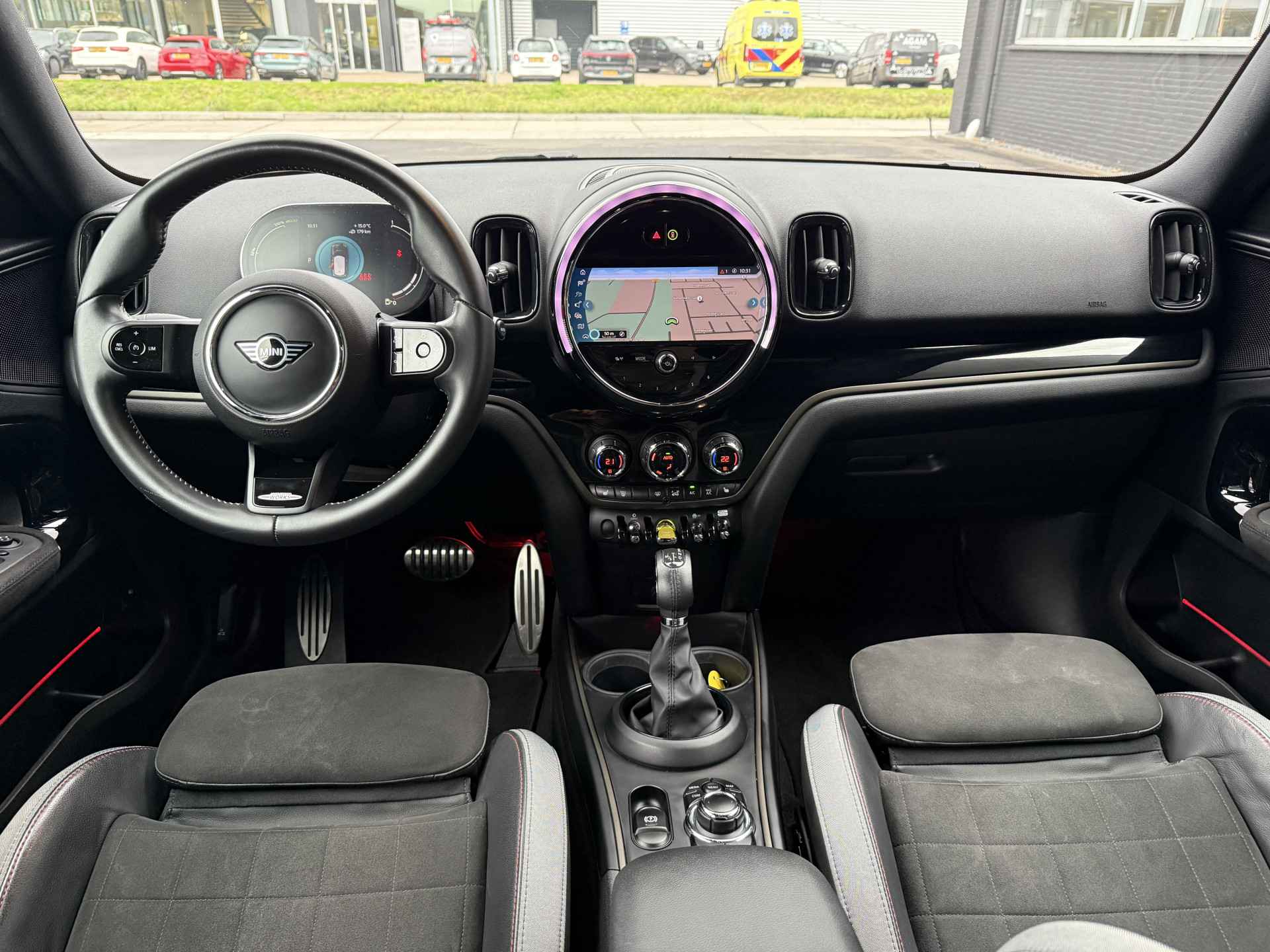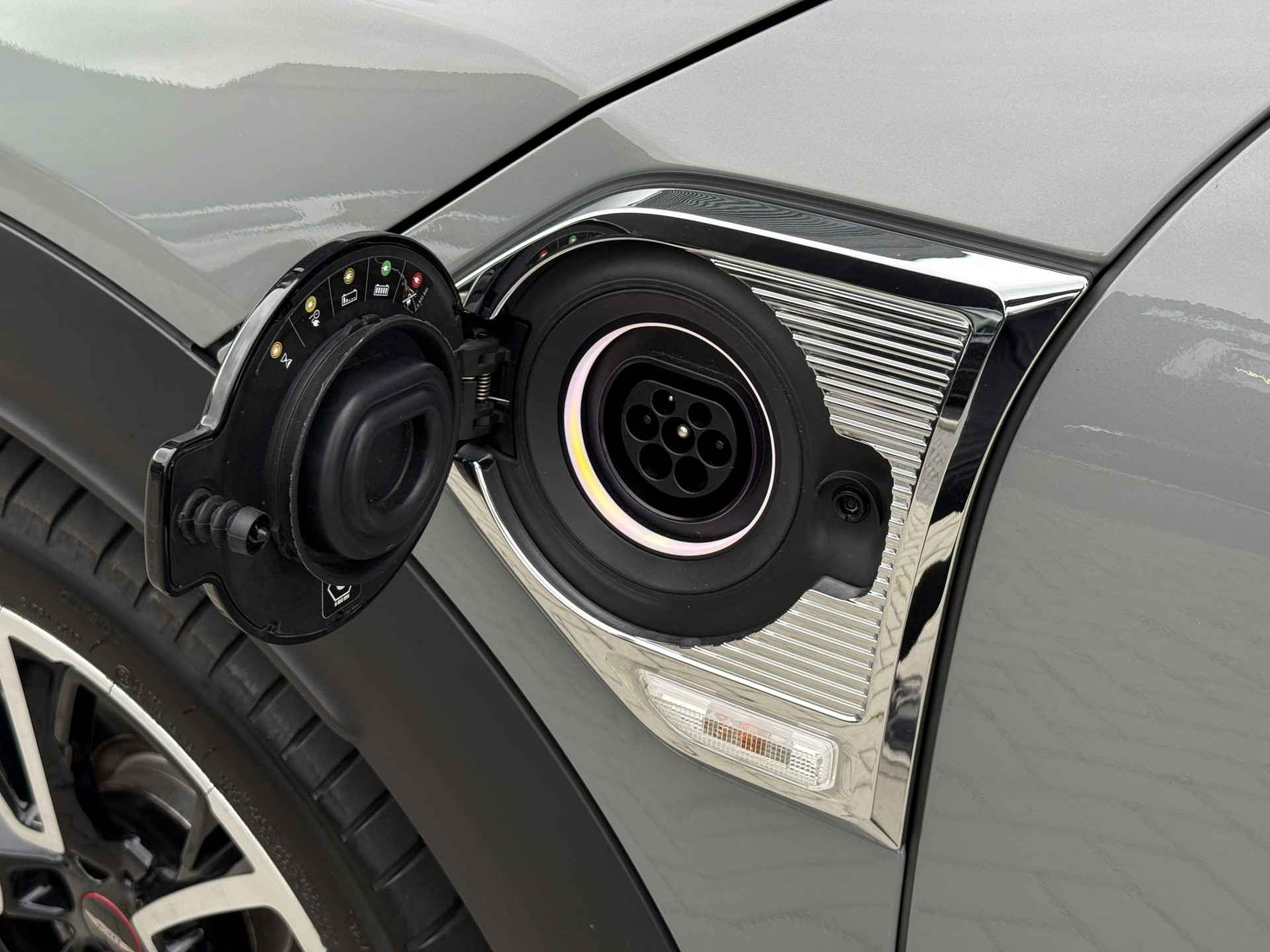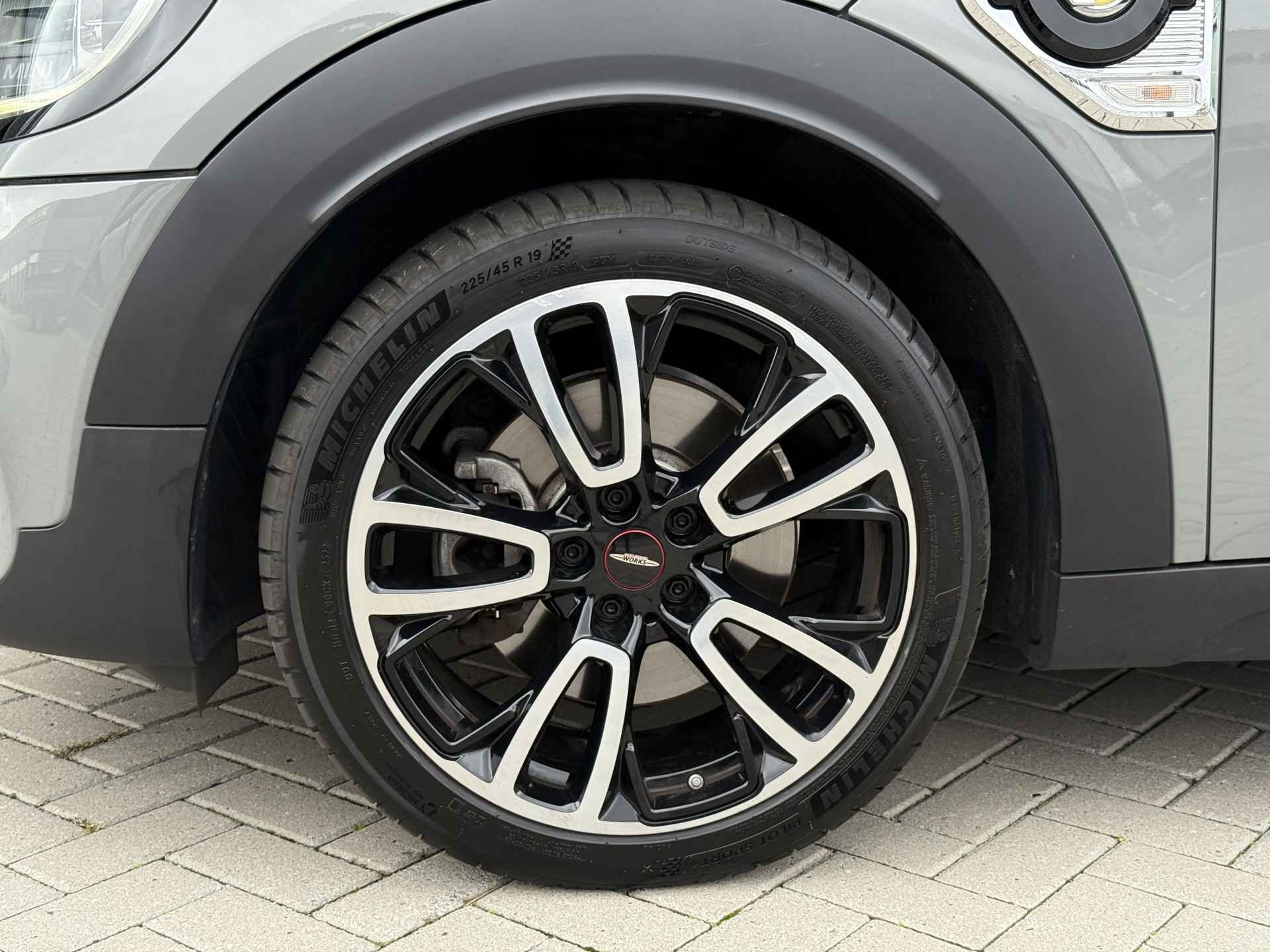 Schitterende Mini Countryman SE Plug in Hybride John Cooper Works in Moonwalk Grey metallic met Black Optic pakket en 19 inch JCW licht metalen velgen. De Mini is voorzien van veel gave opties zoals: Apple carplay, achteruitrijcamera, navigatie, keyless entry, virtuele cockpit, stoelverwarming, parkeersensoren , draadloze telefoonlader, LED sfeer interieur verlichting, cruise control, etc..