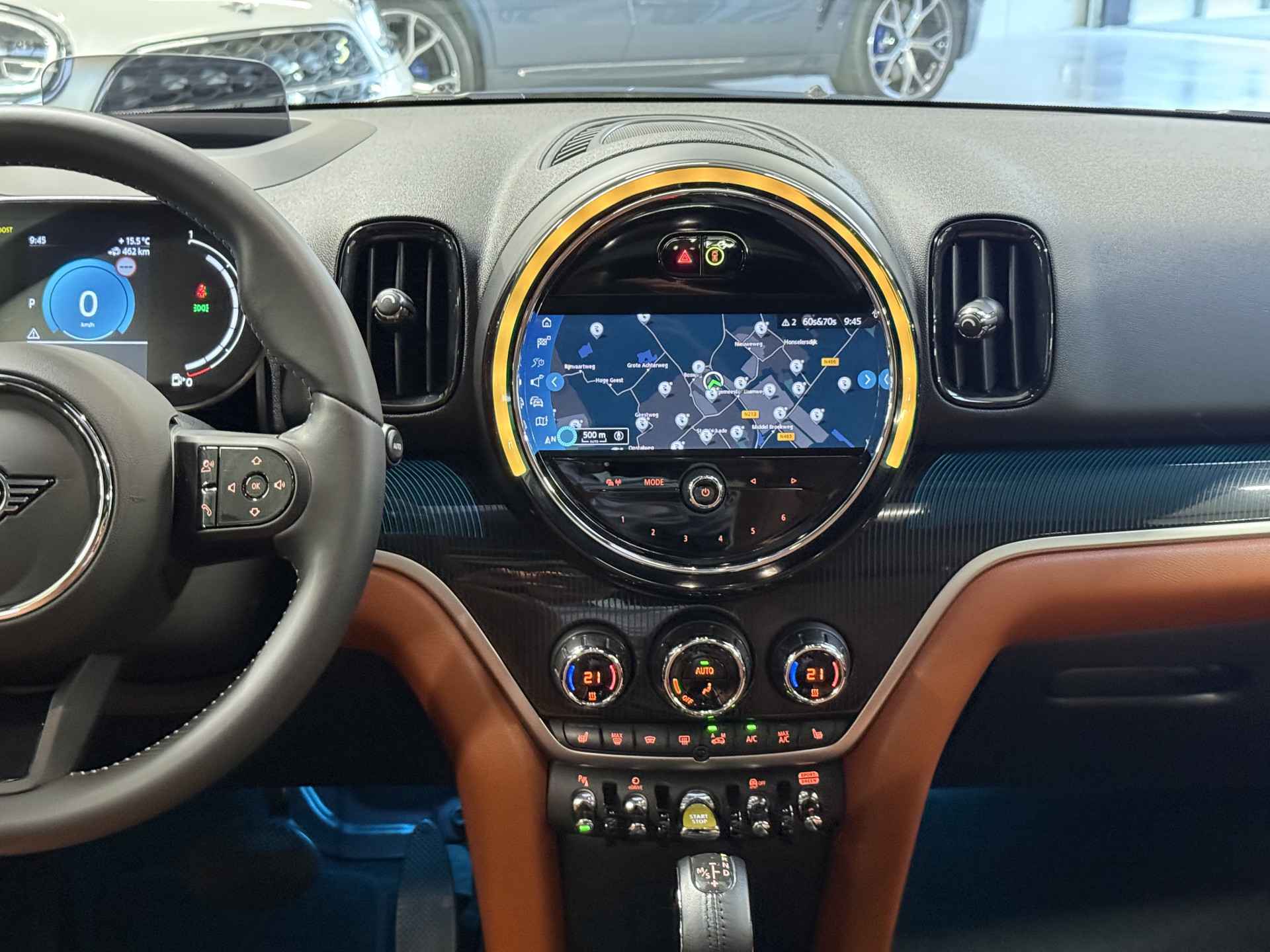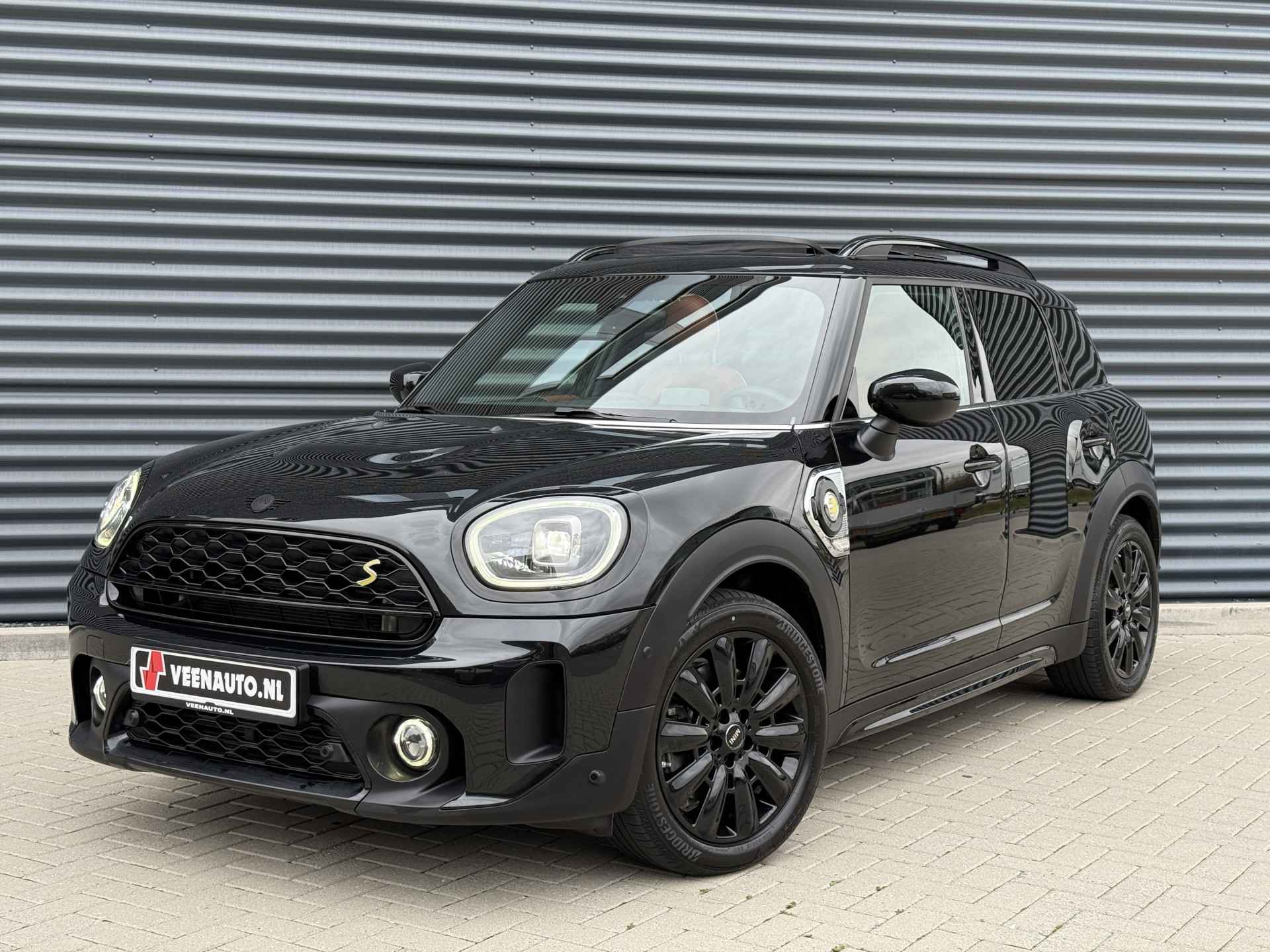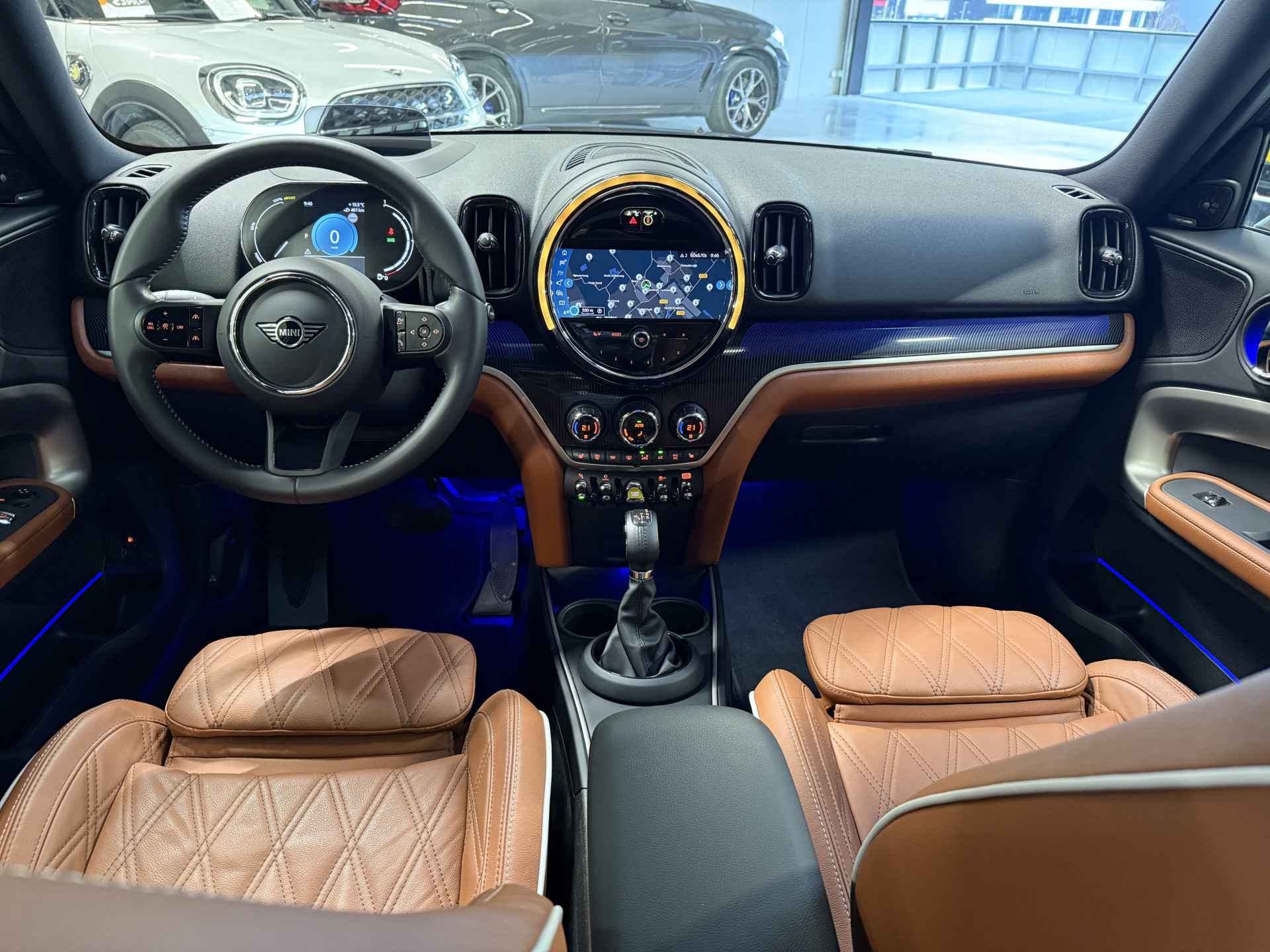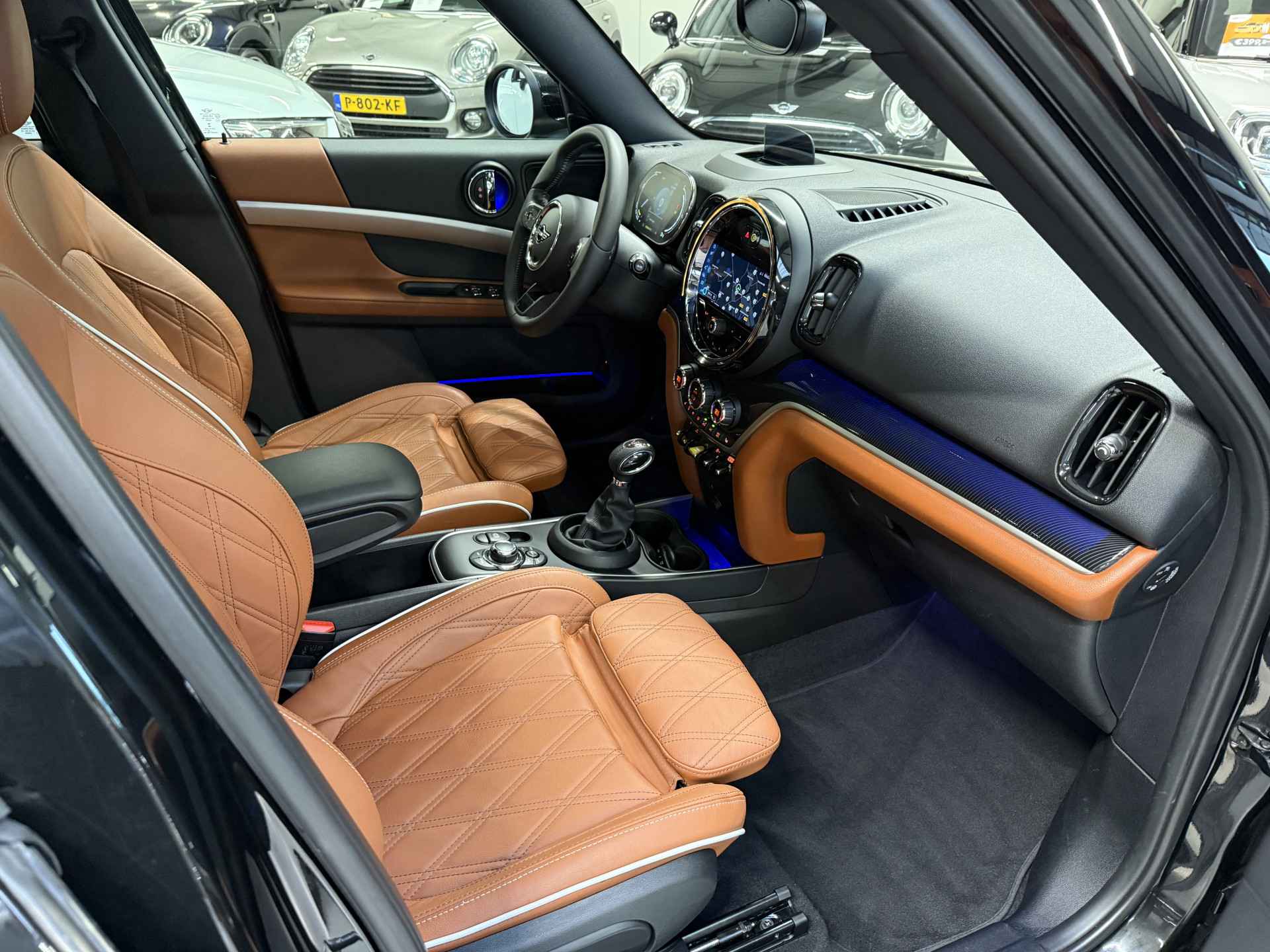 Schitterende Mini Countryman 2.0 Cooper SE ALL4 Plug in Hybrid in Midnight Black metallic met Black optic pakket en 18 inch hoogglans zwarte licht metalen velgen. Deze Mini is bijzonder compleet uitgerust met onder andere de volgende opties: Panorama dak, Harman Kardon Audio, elektrische bedienbare voorstoelen met memory, stoelverwarming, Chester Malt lederen bekleding, LED sfeer interieur verlichtingspakket, Apple Carplay, achteruitrijcamera, navigatie, virtuele cockpit, Head Up display, adaptieve cruise control, keyless entry, parkeersensoren voor + achter met parkeer assistent, etc..