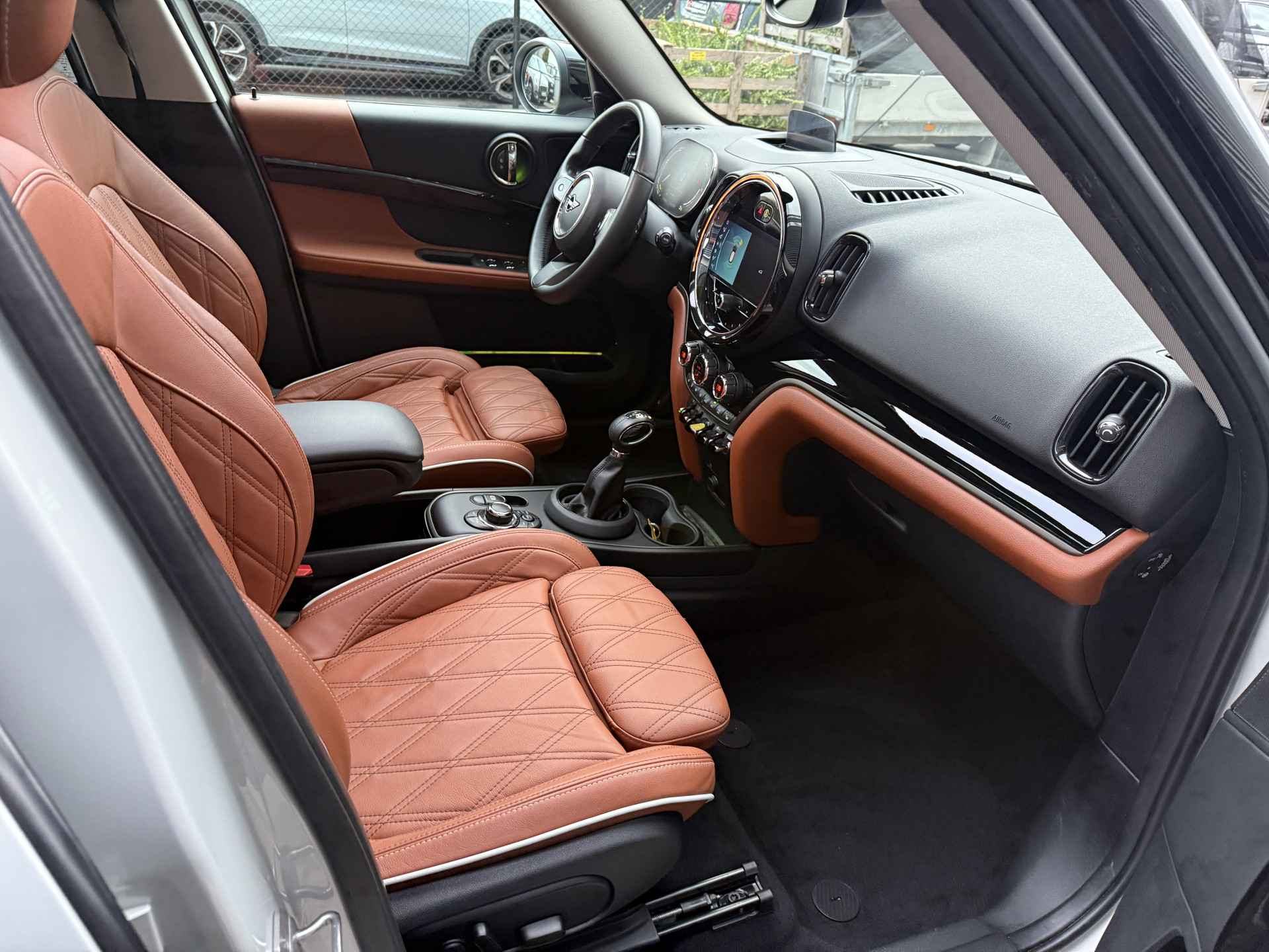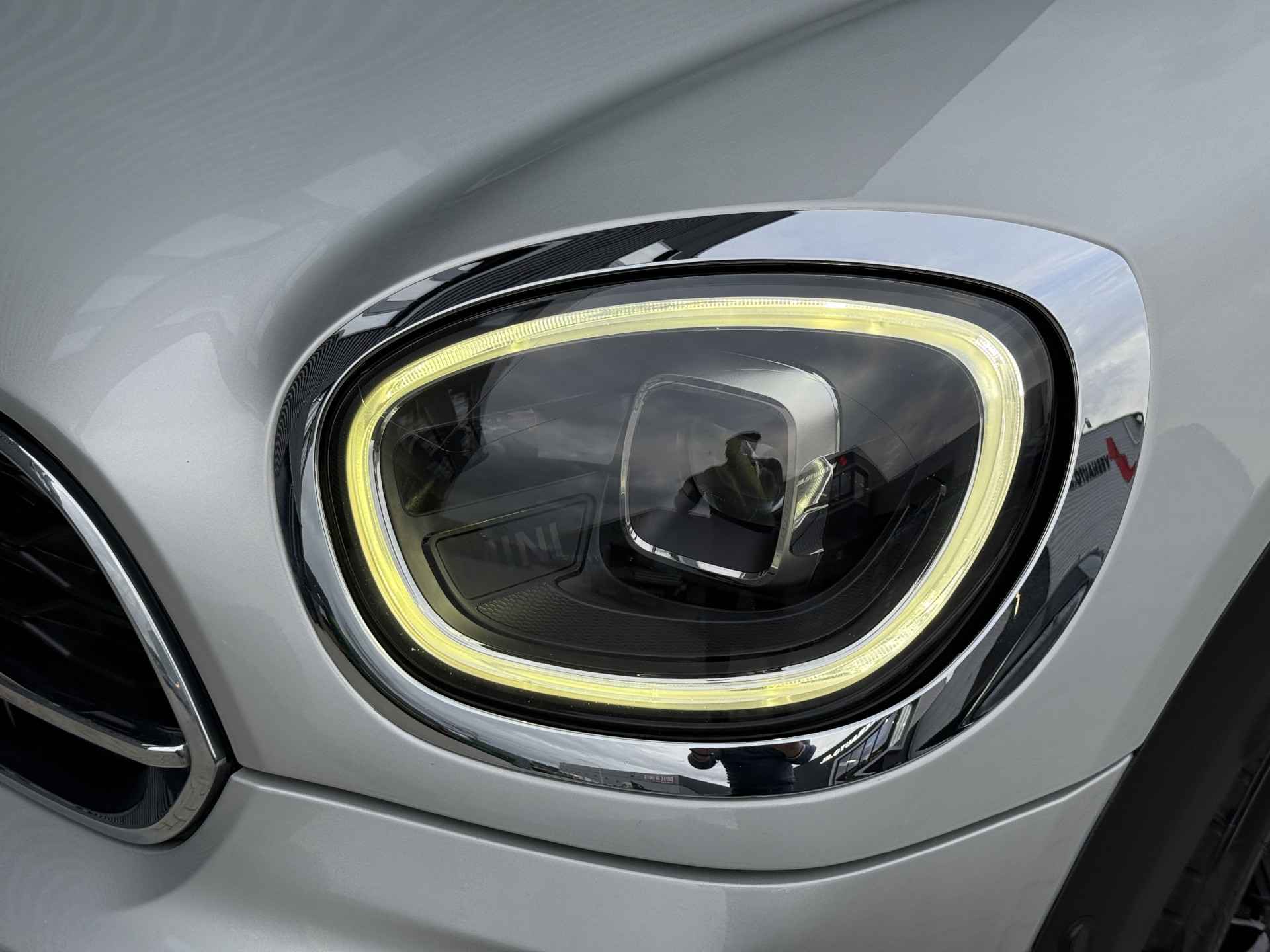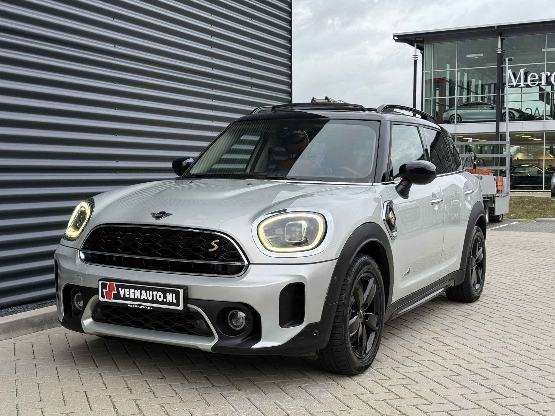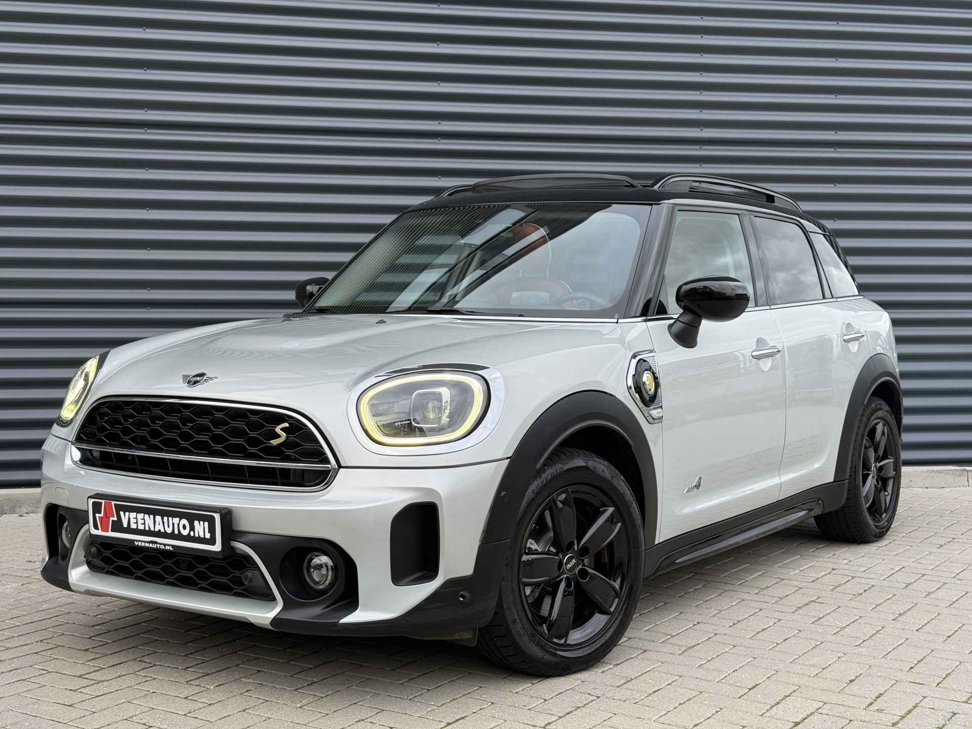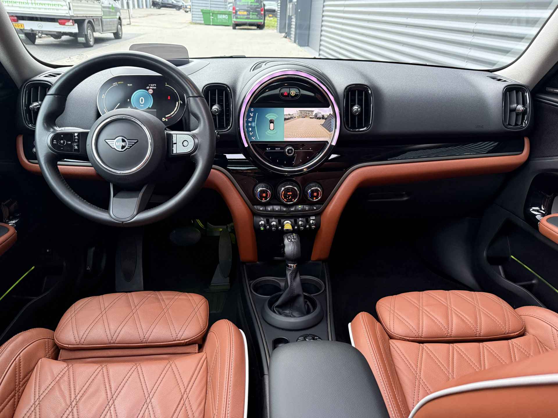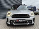 Schitterende Mini Countryman 2.0 Cooper SE ALL4 Plug in Hybrid in White Silver metallic met hoogglans zwarte licht metalen velgen. Deze Mini is bijzonder compleet uitgerust met onder andere de volgende opties: Panorama dak, Chester Malt lederen bekleding, elektrische verstelbare voorstoelen met geheugen,  Harman Kardon Audio, Apple Carplay, achteruitrijcamera, navigatie, virtuele cockpit, Head Up display, adaptieve cruise control, keyless entry, parkeersensoren voor + achter met parkeer assistent, climate control etc..