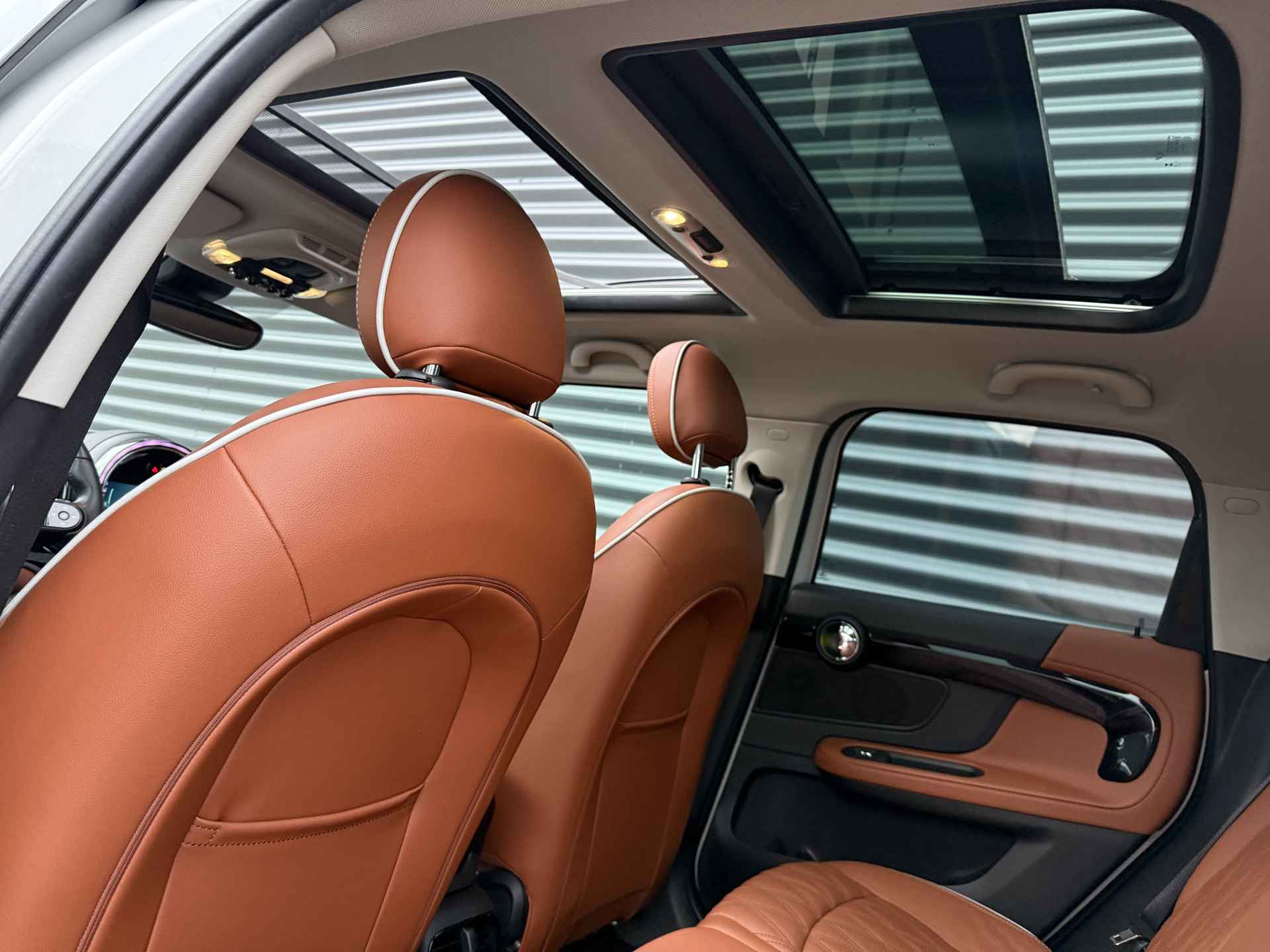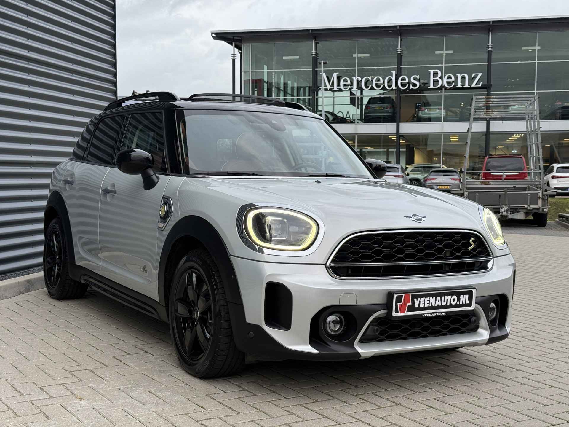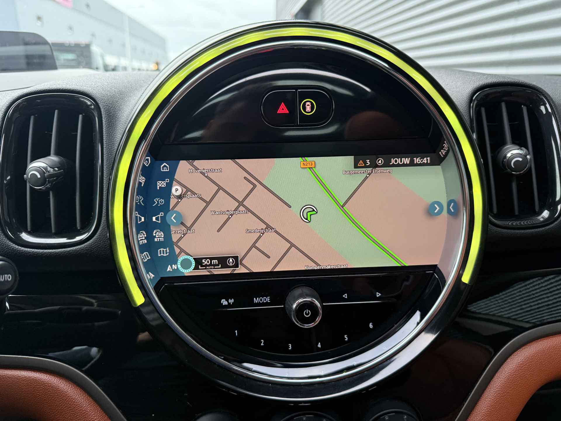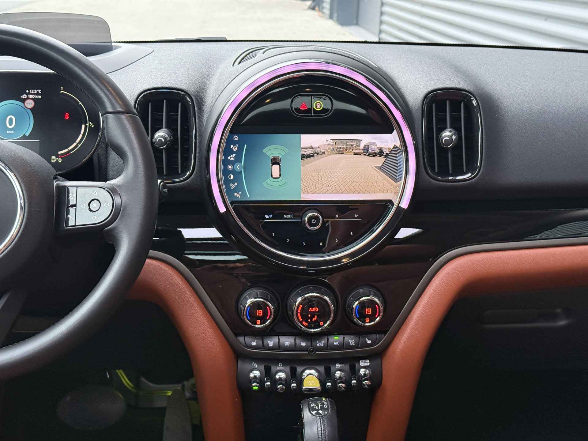 Schitterende Mini Countryman 2.0 Cooper SE ALL4 Plug in Hybrid in White Silver metallic met hoogglans zwarte licht metalen velgen. Deze Mini is bijzonder compleet uitgerust met onder andere de volgende opties: Panorama dak, Chester Malt lederen bekleding, elektrische verstelbare voorstoelen met geheugen,  Harman Kardon Audio, Apple Carplay, achteruitrijcamera, navigatie, virtuele cockpit, Head Up display, adaptieve cruise control, keyless entry, parkeersensoren voor + achter met parkeer assistent, climate control etc..