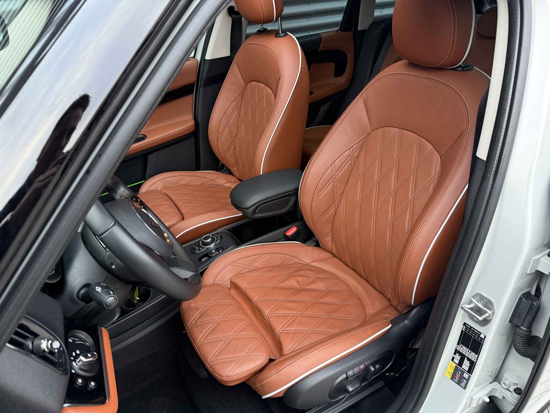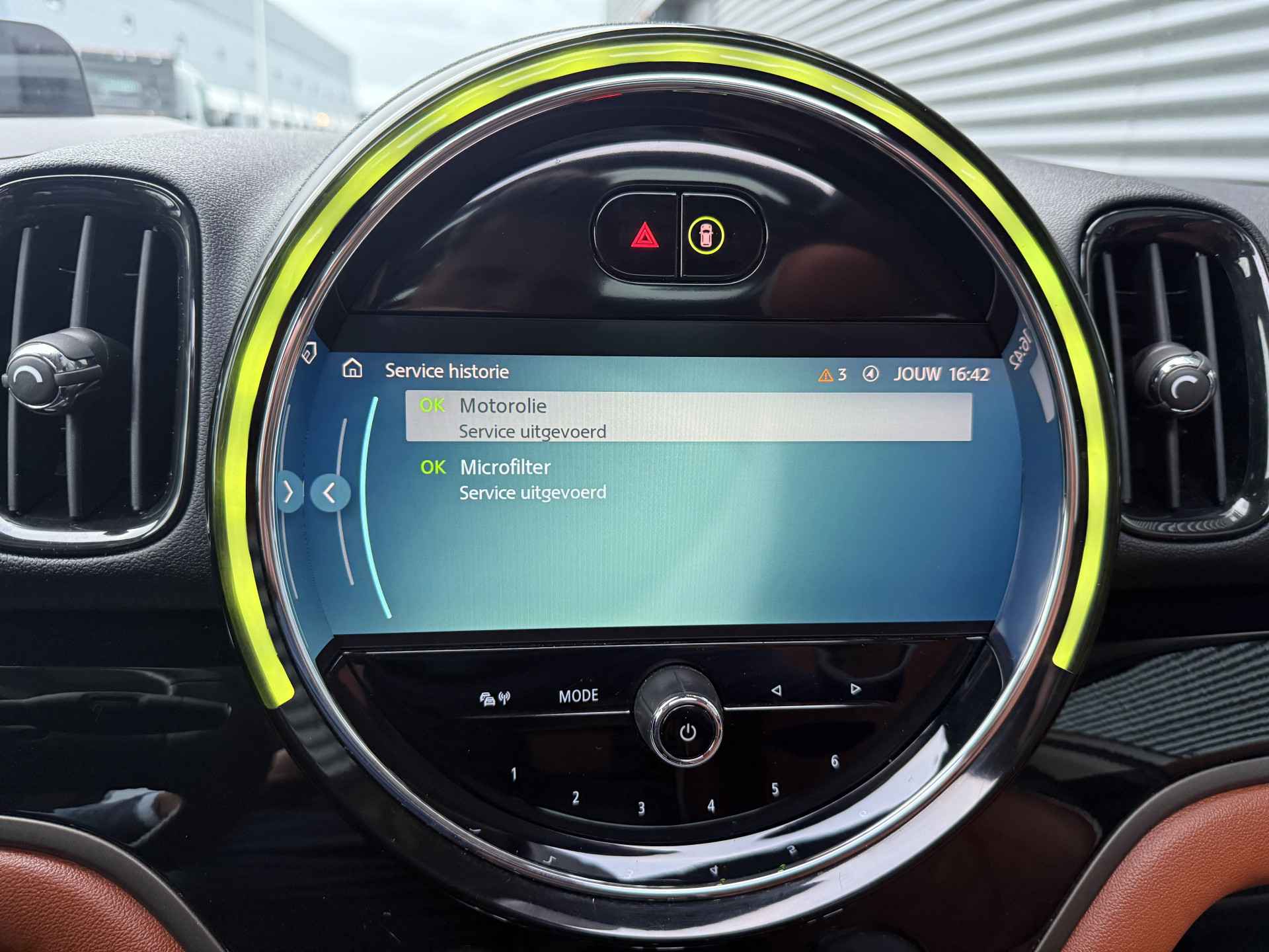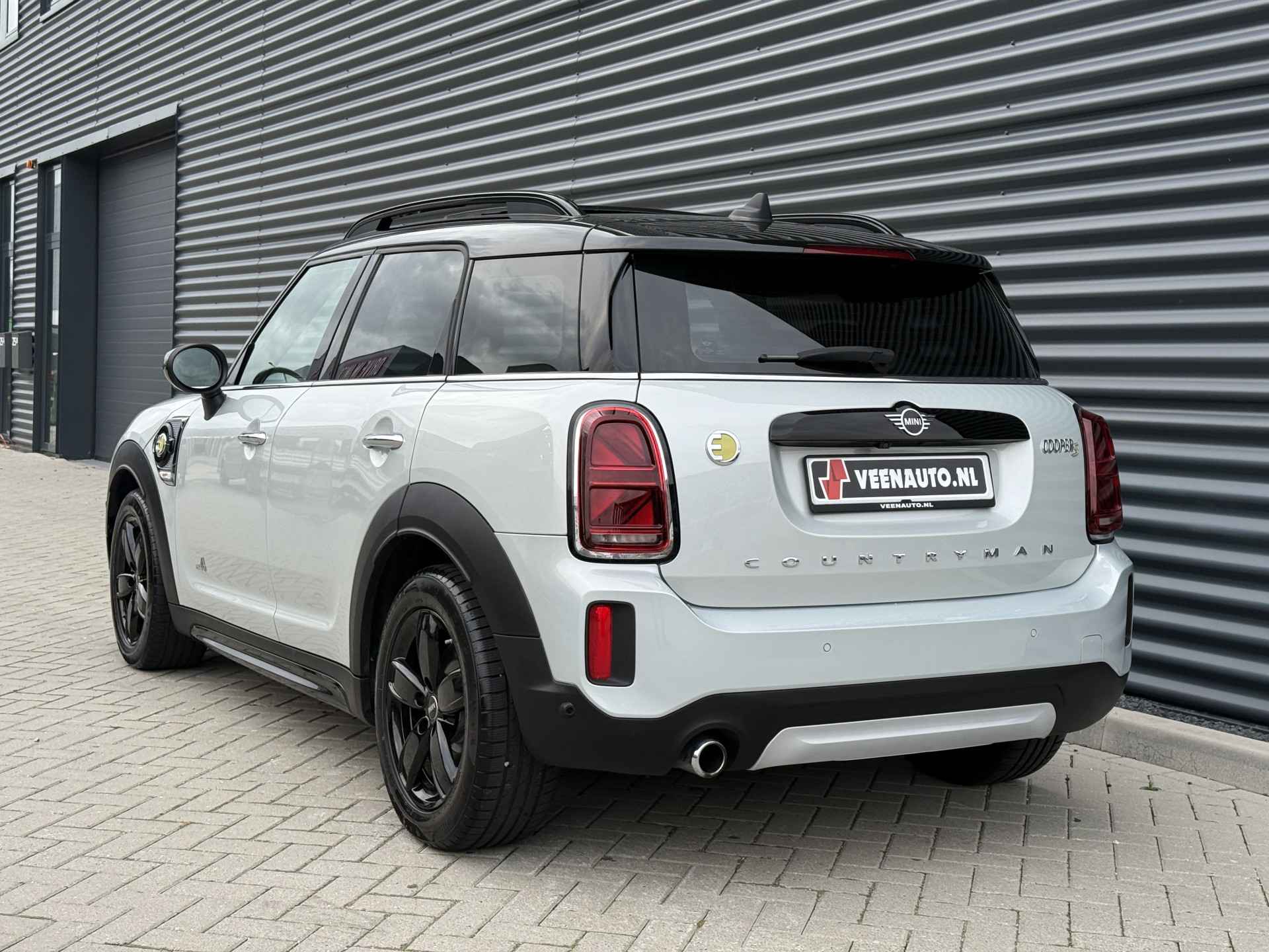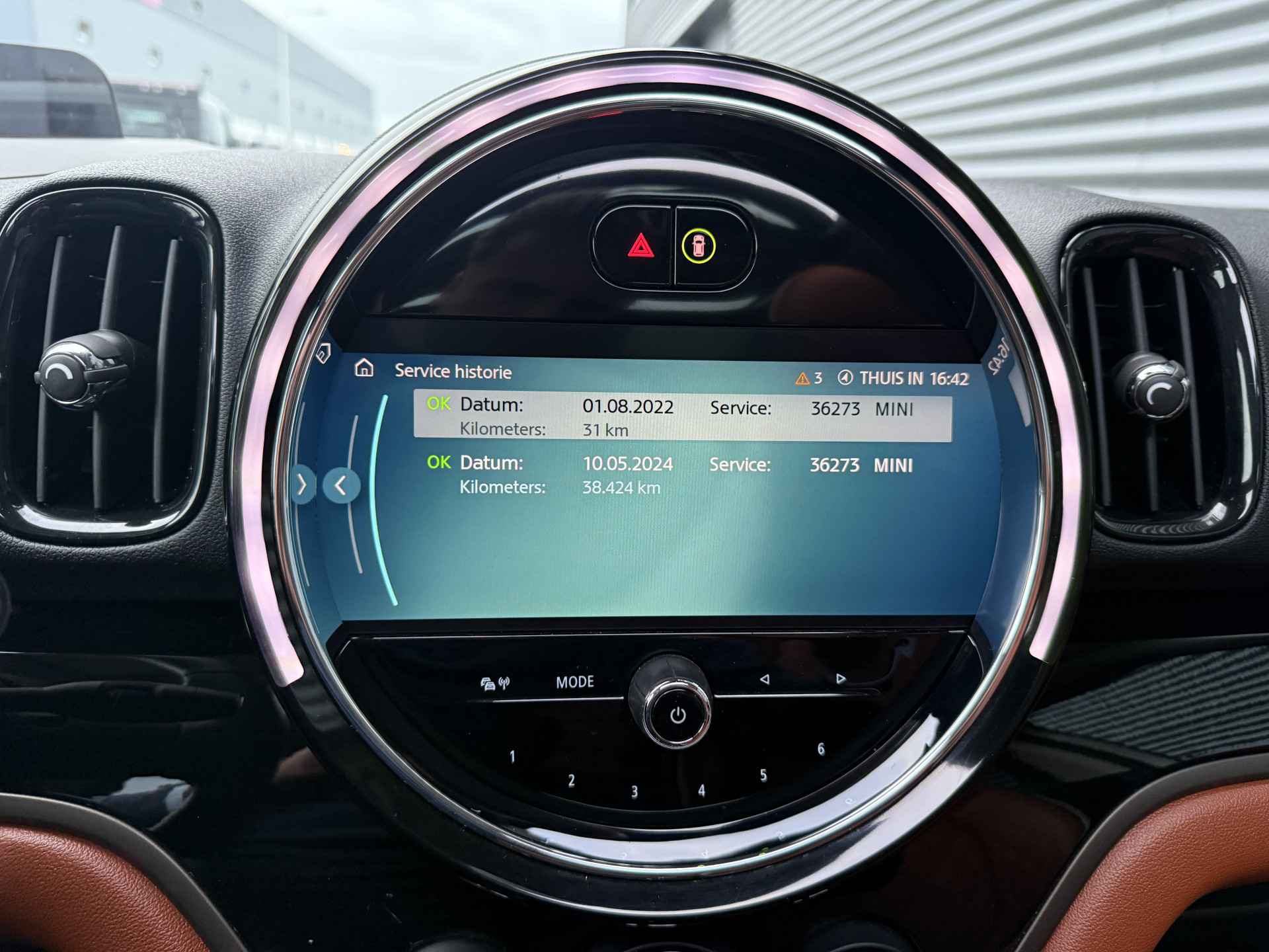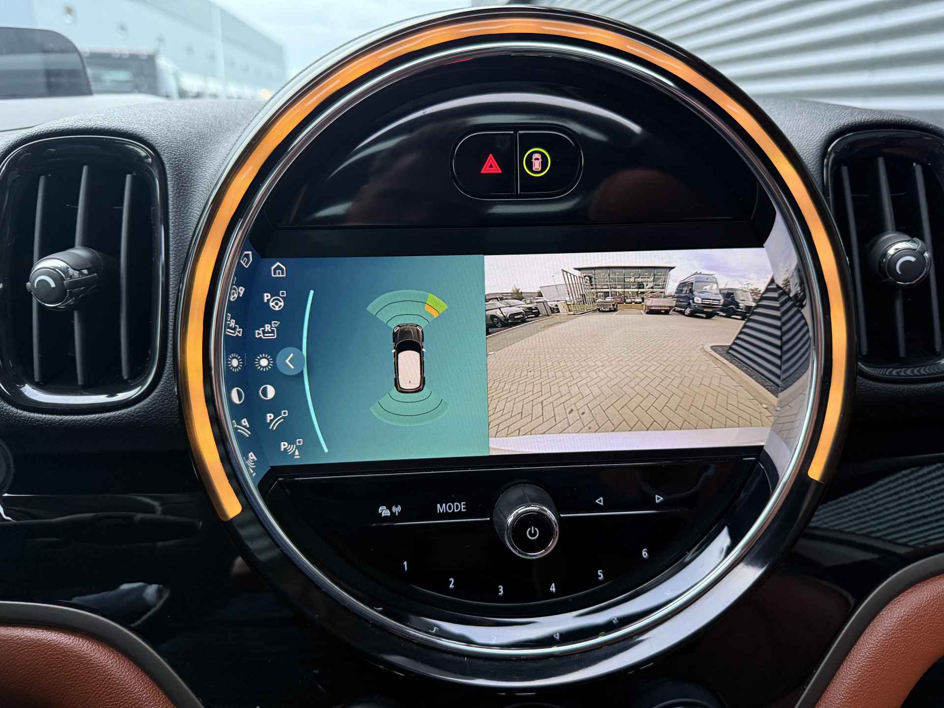 Schitterende Mini Countryman 2.0 Cooper SE ALL4 Plug in Hybrid in White Silver metallic met hoogglans zwarte licht metalen velgen. Deze Mini is bijzonder compleet uitgerust met onder andere de volgende opties: Panorama dak, Chester Malt lederen bekleding, elektrische verstelbare voorstoelen met geheugen,  Harman Kardon Audio, Apple Carplay, achteruitrijcamera, navigatie, virtuele cockpit, Head Up display, adaptieve cruise control, keyless entry, parkeersensoren voor + achter met parkeer assistent, climate control etc..