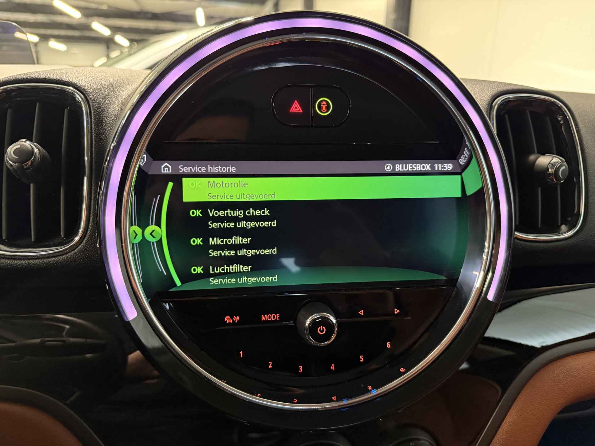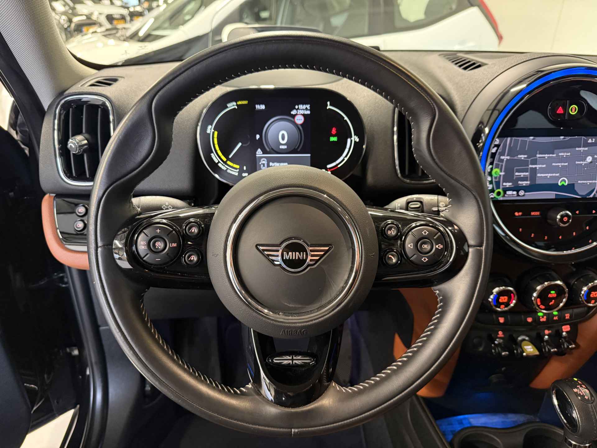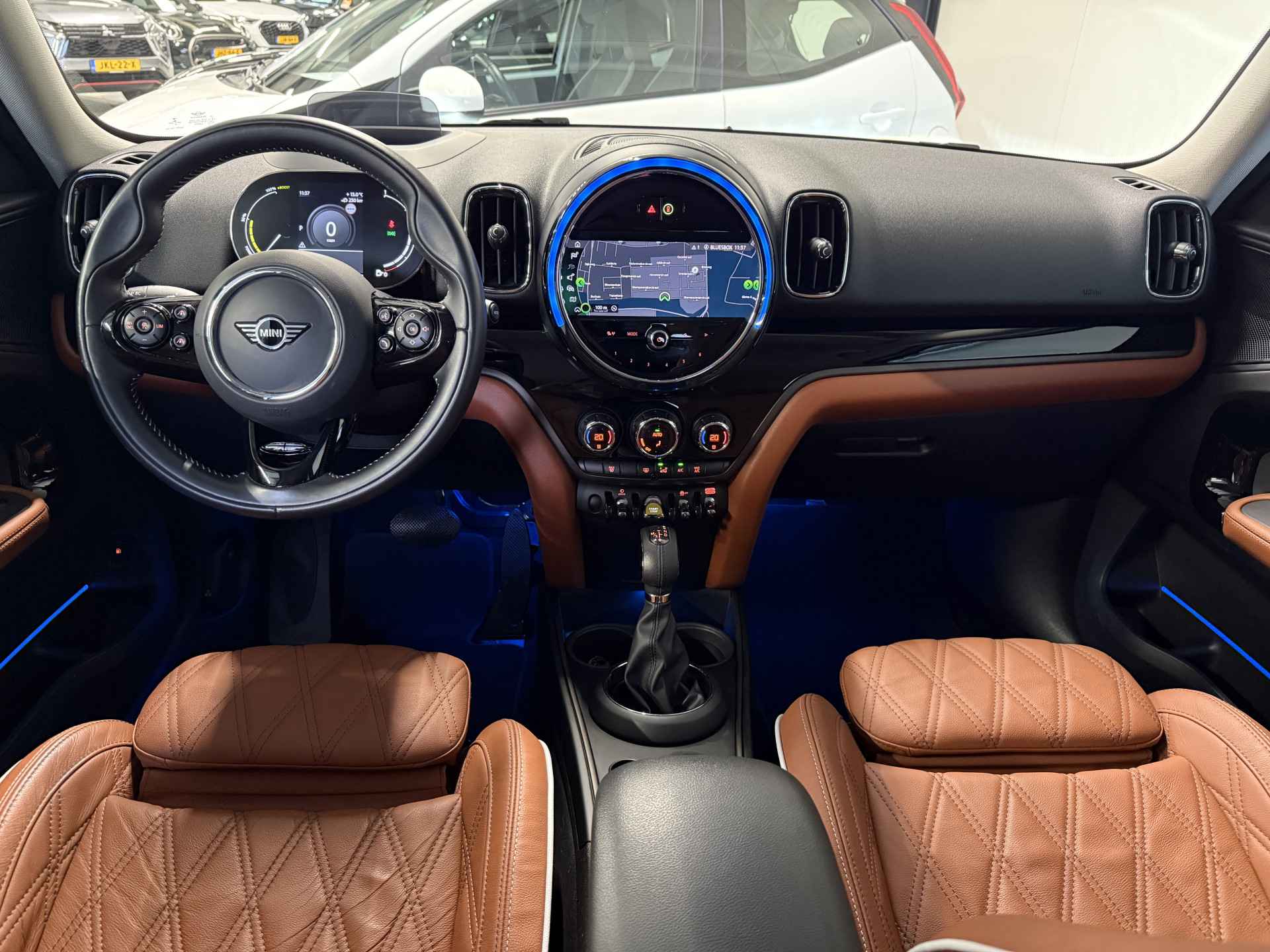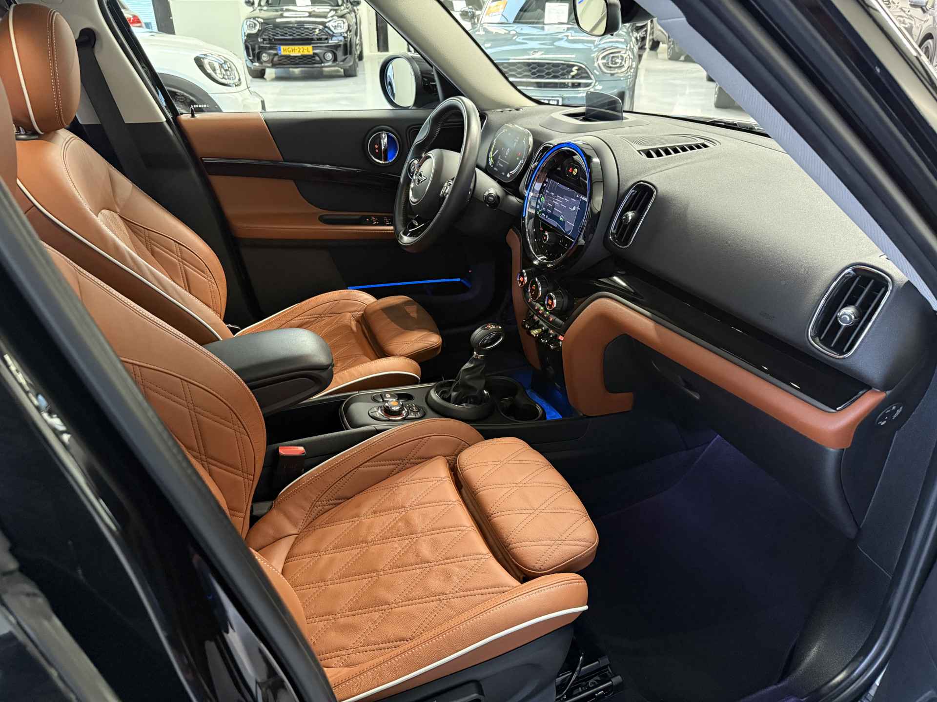 Schitterende Mini Countryman 2.0 Cooper SE ALL4 Plug in Hybrid in Midnight Black metallic met hoogglans zwarte 18 inch licht metalen velgen en Black Optic pakket. Deze Mini is bijzonder compleet uitgerust met onder andere de volgende opties: Chester Malt lederen sport-comfort stoelen, Apple Carplay, achteruitrijcamera, navigatie, virtuele cockpit, Head Up display, adaptieve cruise control, parkeersensoren, climate contol, LED sfeer interieur verlichting, etc..