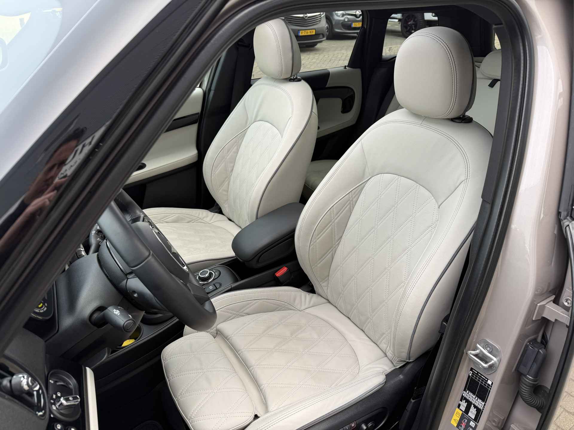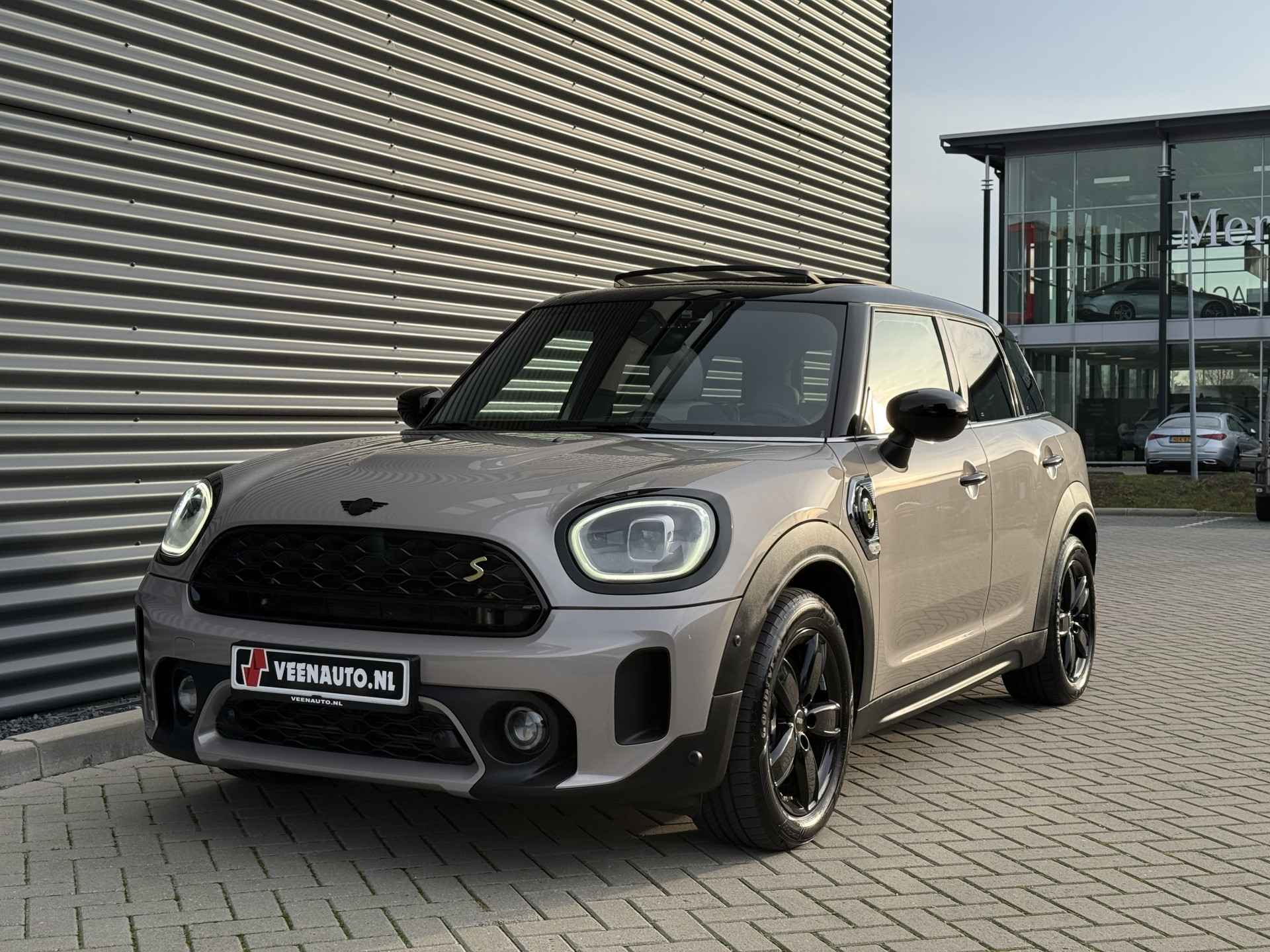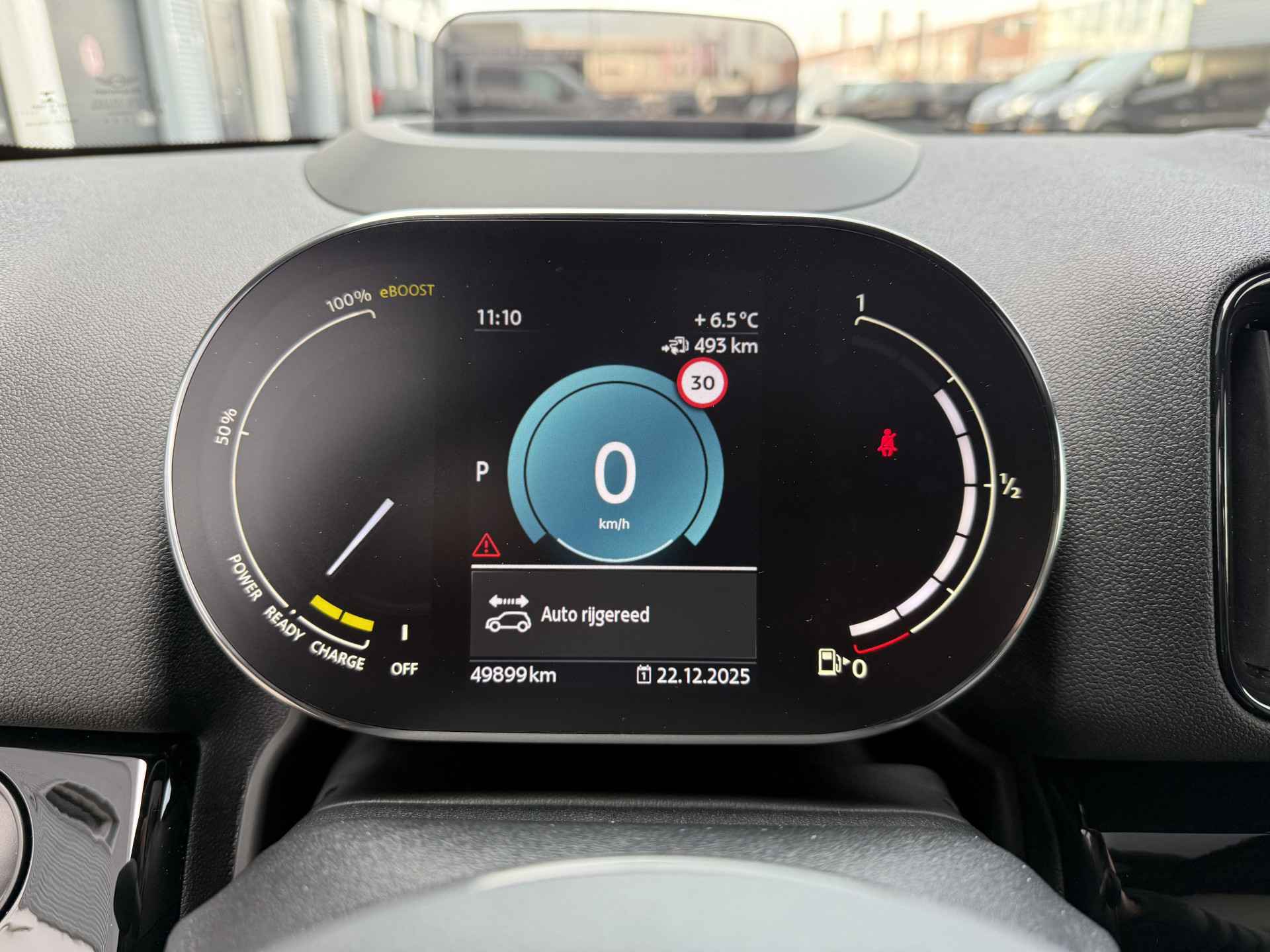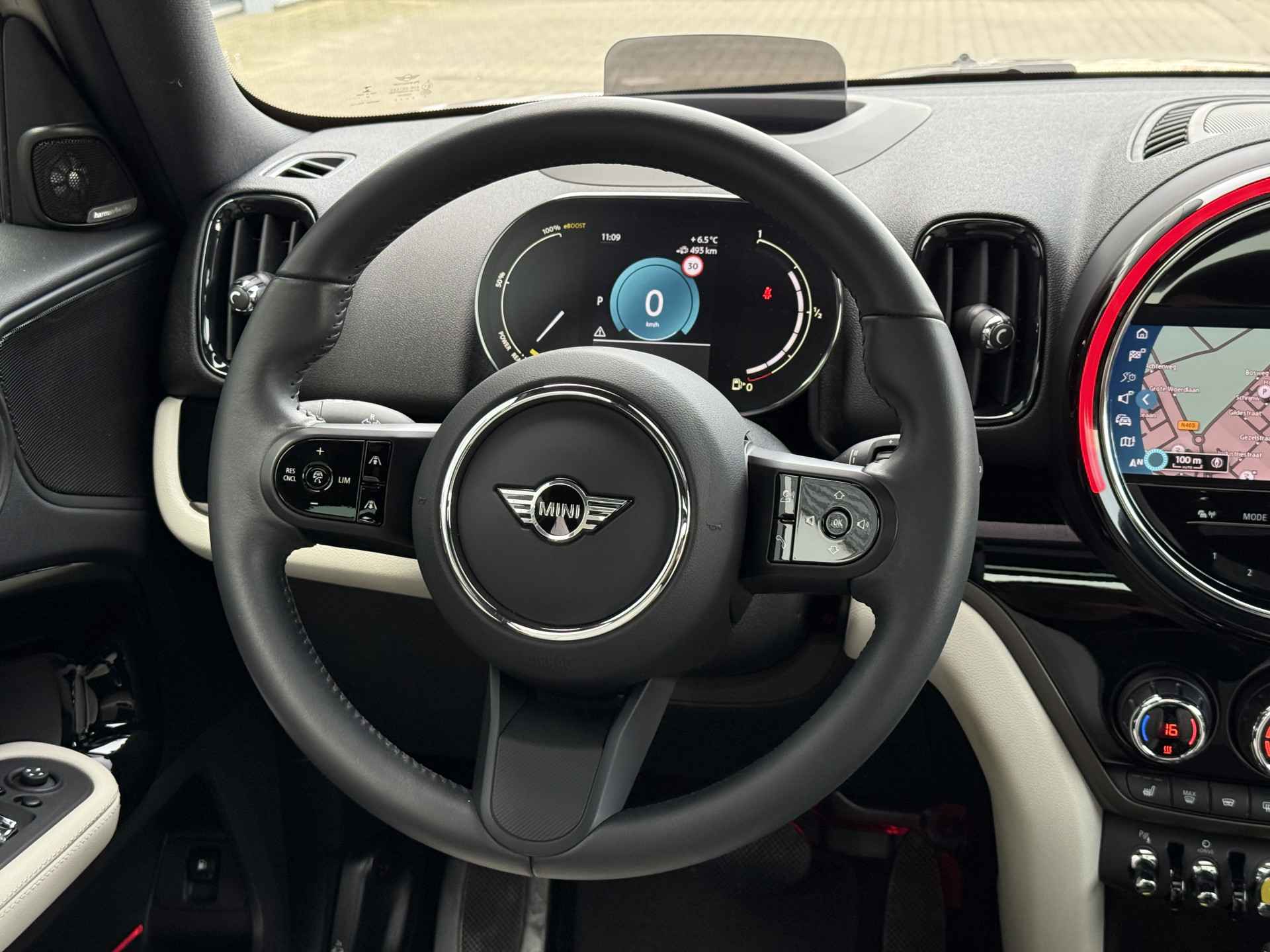 Schitterende Mini Countryman 2.0 Cooper SE ALL4 Plug in Hybrid in Rooftop Grey metallic met hoogglans zwarte licht metalen velgen. Deze Mini is bijzonder compleet uitgerust met onder andere de volgende opties: Panorama dak, elektrische bedienbare voorstoelen met memory, lederen bekleding, Harman Kardon Audio, LED interieur sfeer verlichtingspakket, Apple Carplay, achteruitrijcamera, navigatie, virtuele cockpit, Head Up display, adaptieve cruise control, keyless entry, parkeersensoren voor + achter met parkeer assistent, etc..