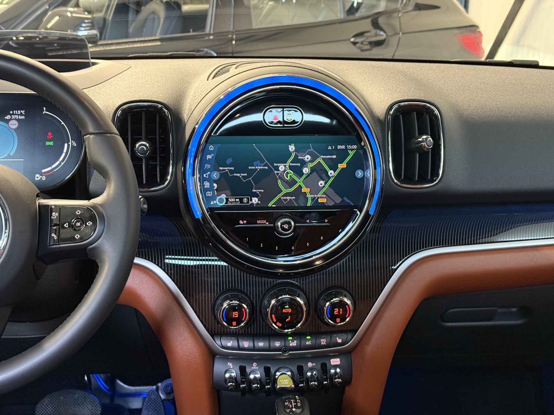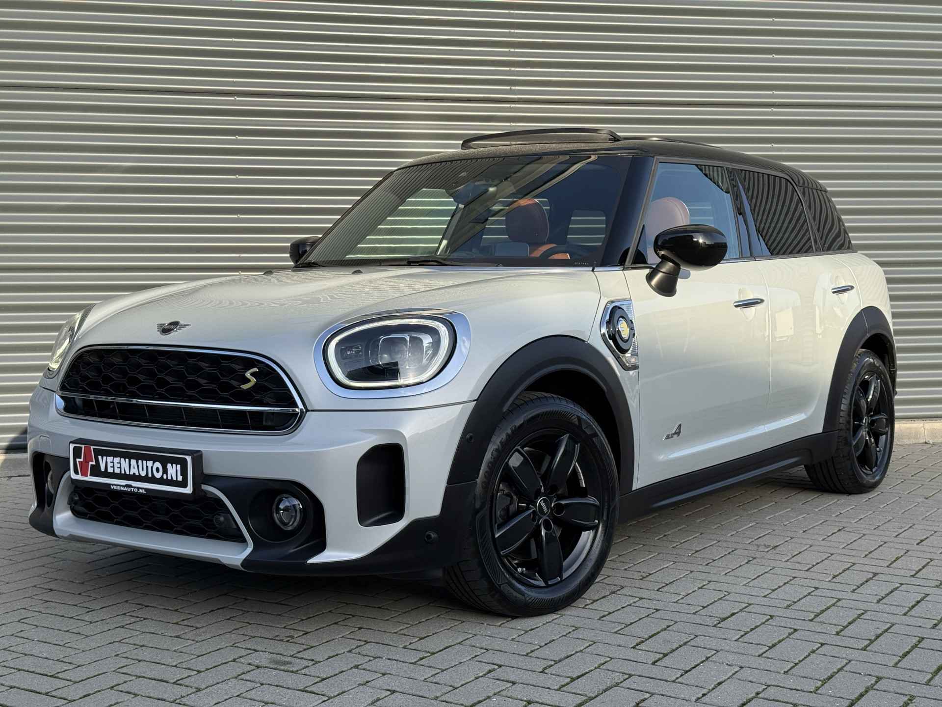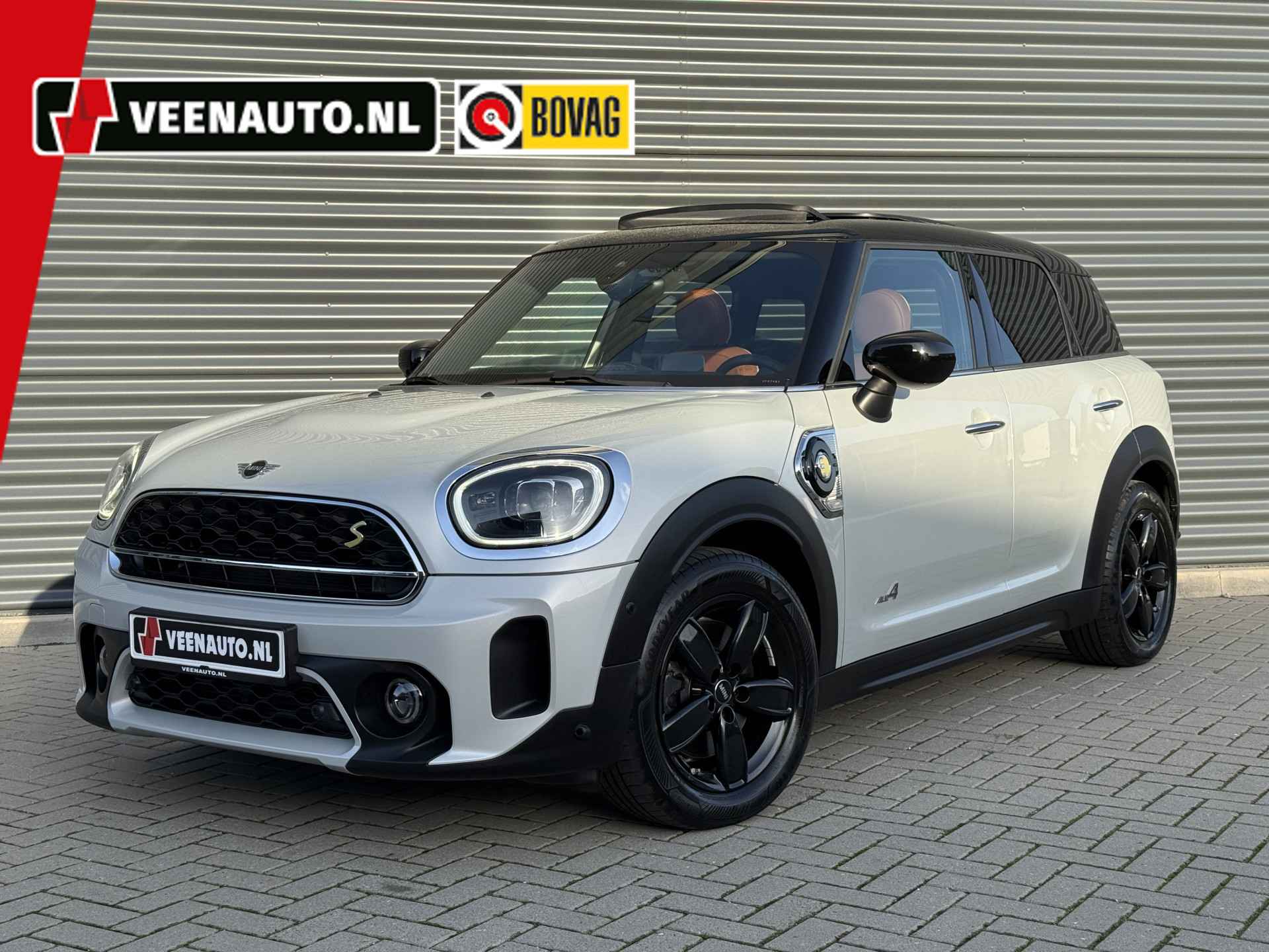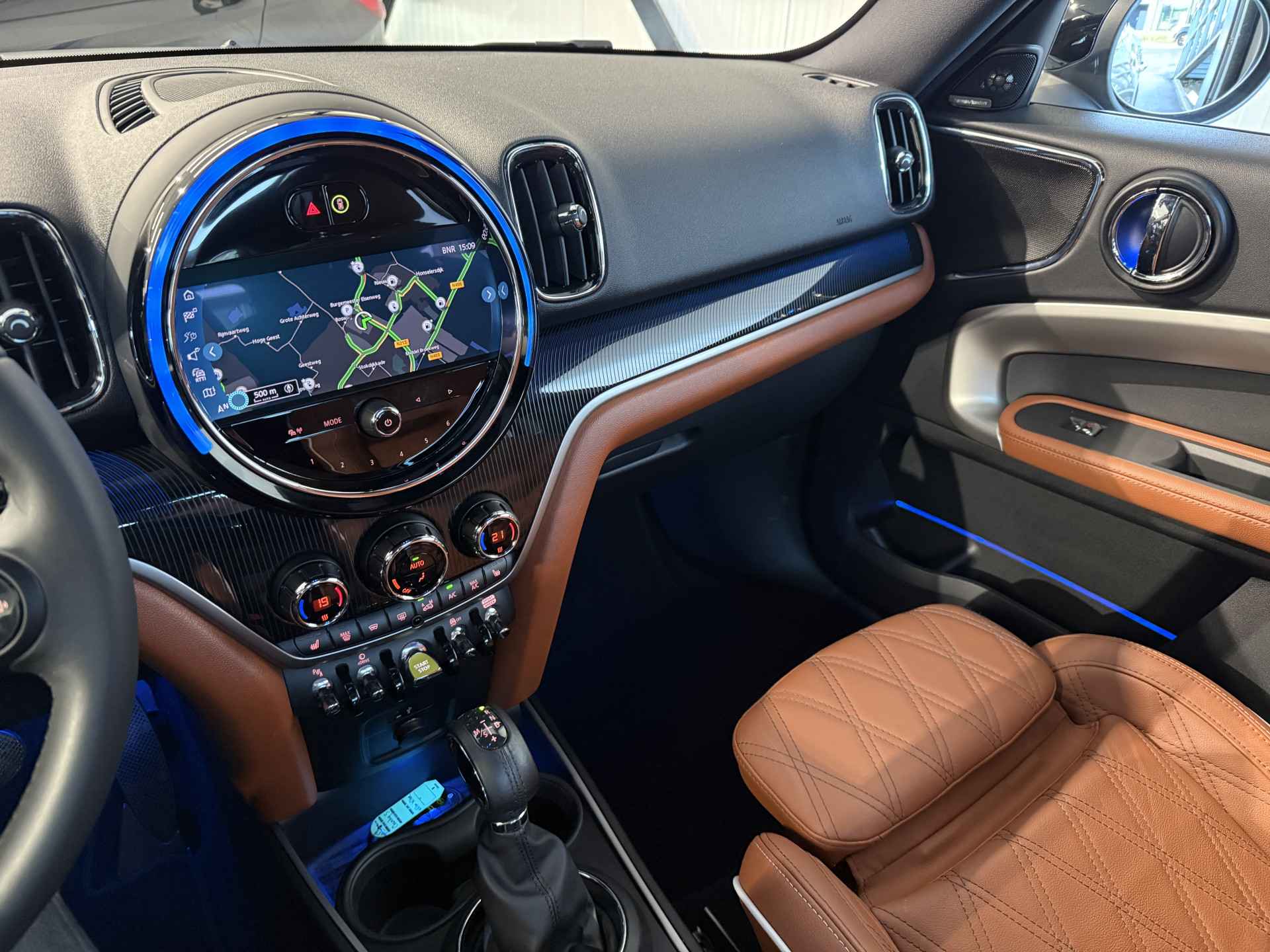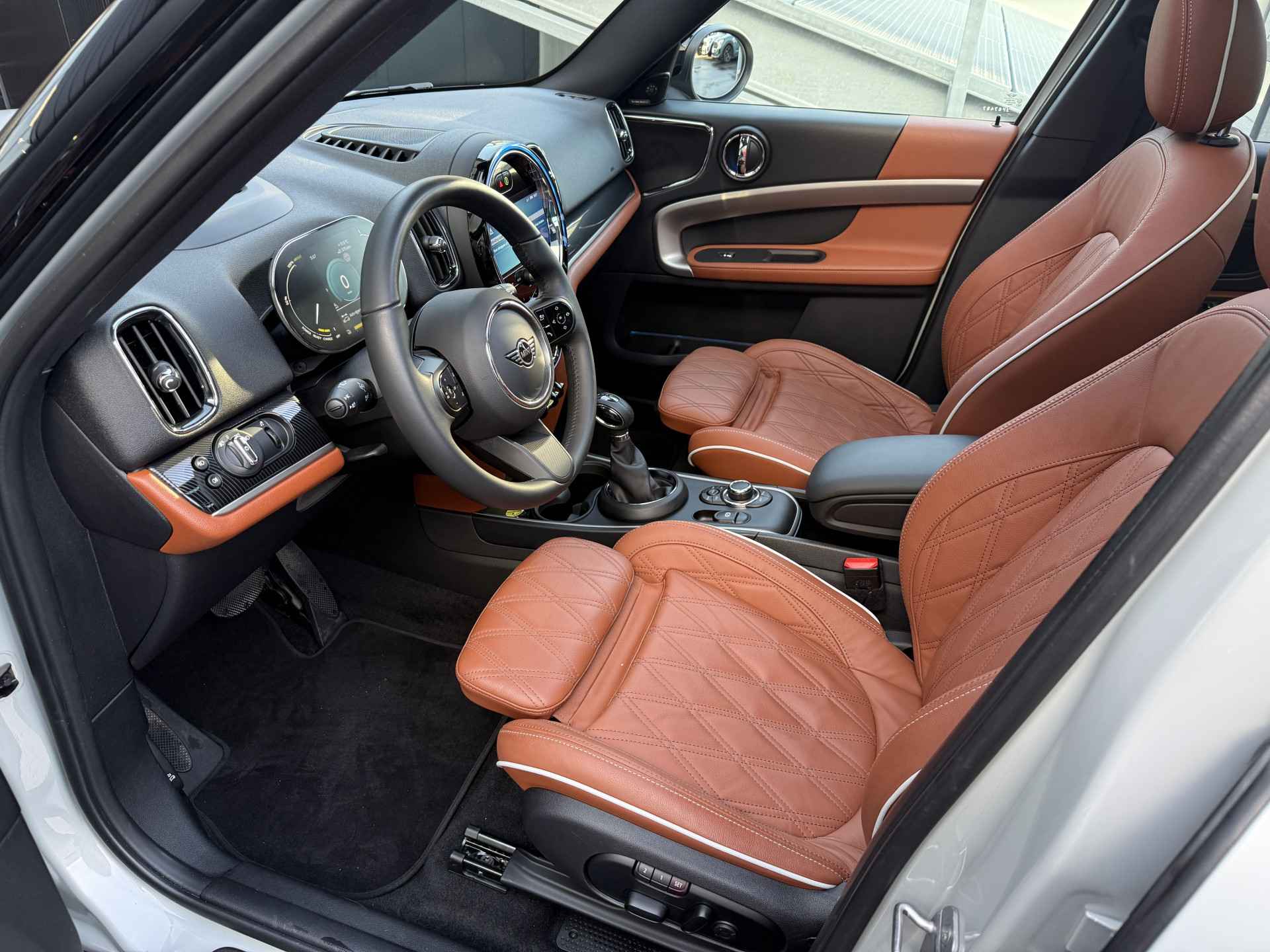 Schitterende Mini Countryman 2.0 Cooper SE ALL4 Plug in Hybrid in White Silver metallic met hoogglans zwarte licht metalen velgen. Deze Mini is bijzonder compleet uitgerust met onder andere de volgende opties: Panorama dak, elektrische bedienbare voorstoelen met memory, lederen bekleding, Harman Kardon Audio, uitgebreid LED interieur sfeer verlichtingspakket, Apple Carplay, achteruitrijcamera, navigatie, virtuele cockpit, Head Up display, adaptieve cruise control, keyless entry, parkeersensoren voor + achter met parkeer assistent, etc..