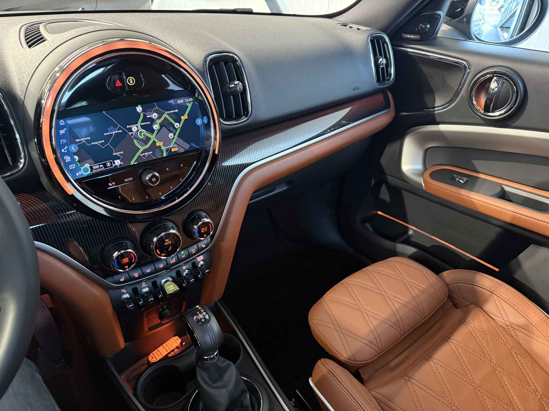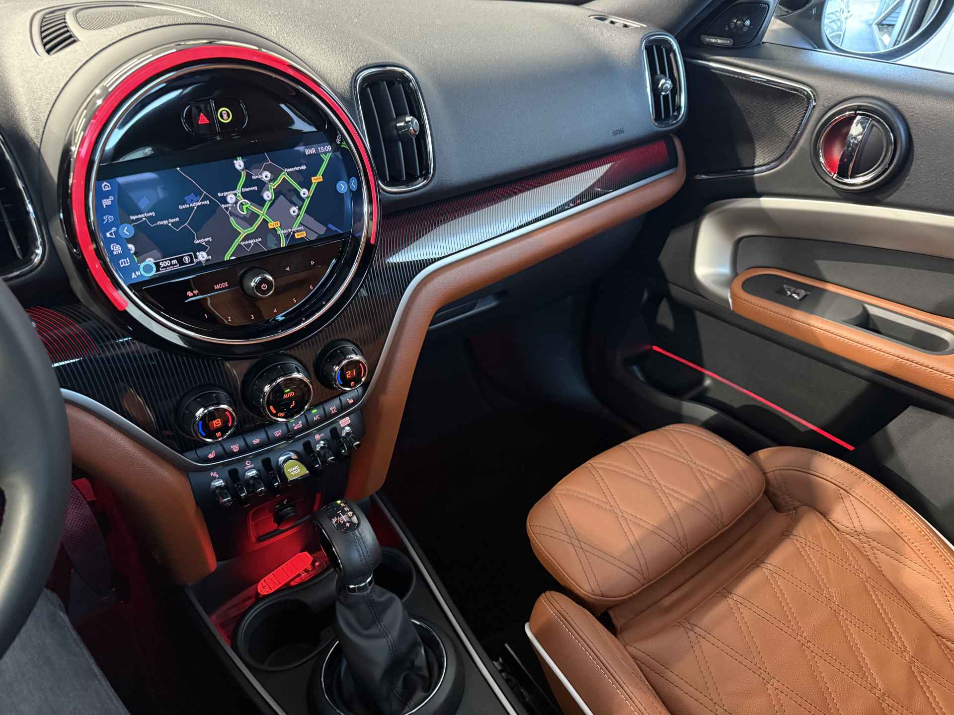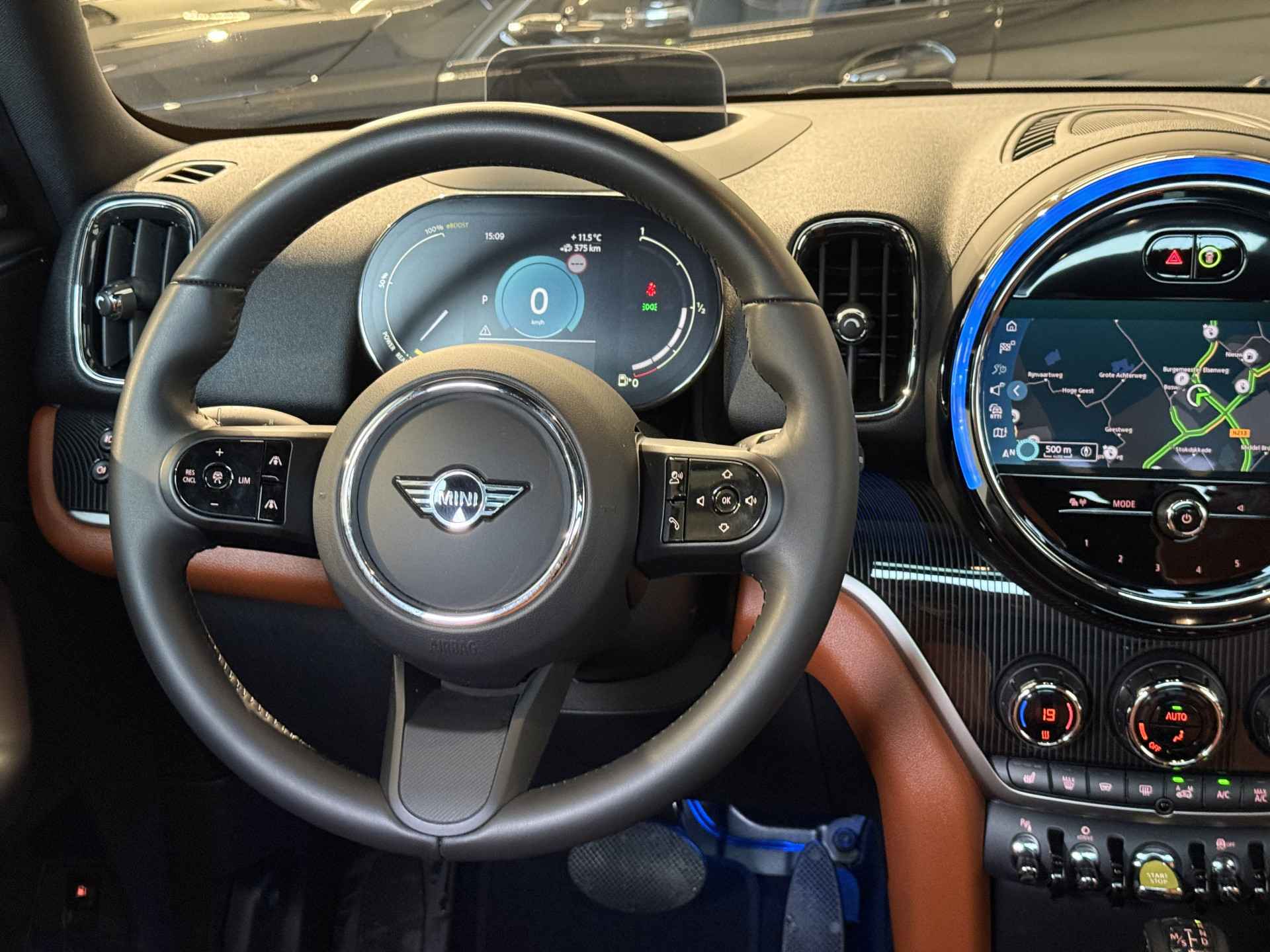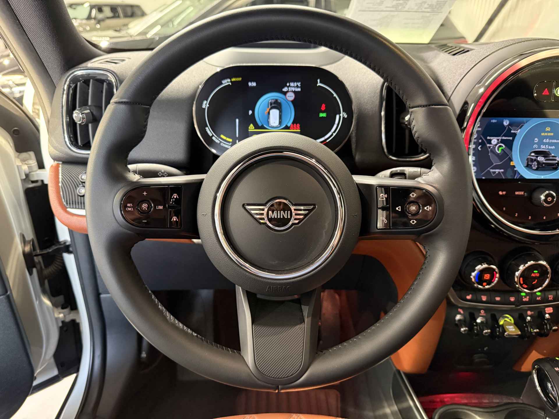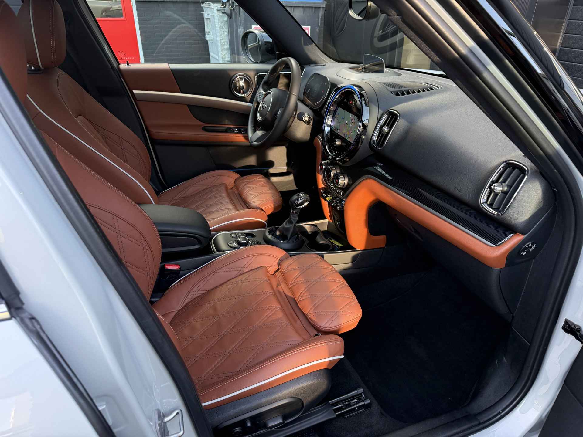 Schitterende Mini Countryman 2.0 Cooper SE ALL4 Plug in Hybrid in White Silver metallic met hoogglans zwarte licht metalen velgen. Deze Mini is bijzonder compleet uitgerust met onder andere de volgende opties: Panorama dak, elektrische bedienbare voorstoelen met memory, lederen bekleding, Harman Kardon Audio, uitgebreid LED interieur sfeer verlichtingspakket, Apple Carplay, achteruitrijcamera, navigatie, virtuele cockpit, Head Up display, adaptieve cruise control, keyless entry, parkeersensoren voor + achter met parkeer assistent, etc..